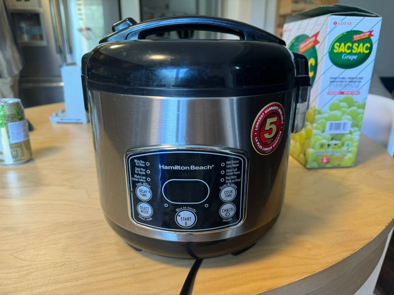 This is a Hamilton Beach programmable rice cooker. 7 cups of uncooked capacity. It works perfectly but the container inside has some scratches, please note that. Overall it is in good condition.