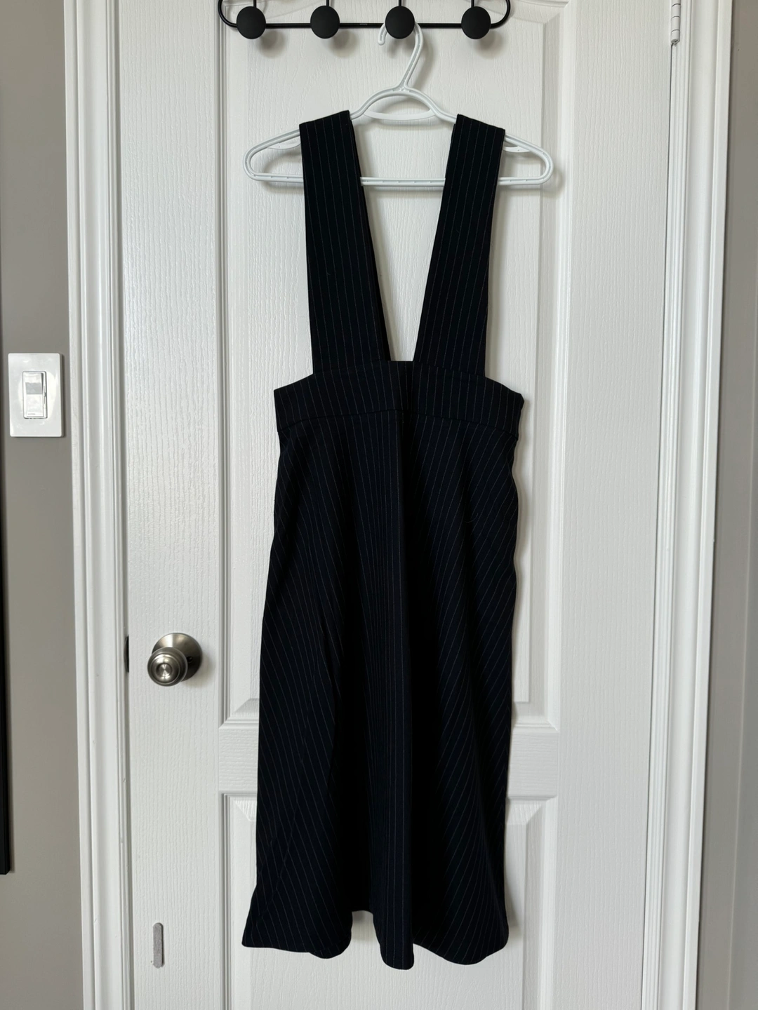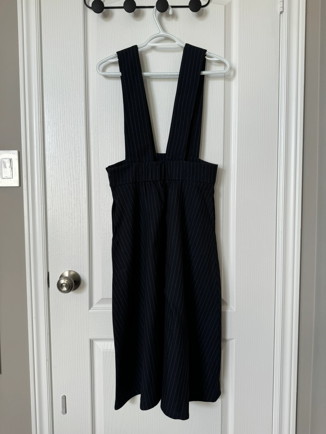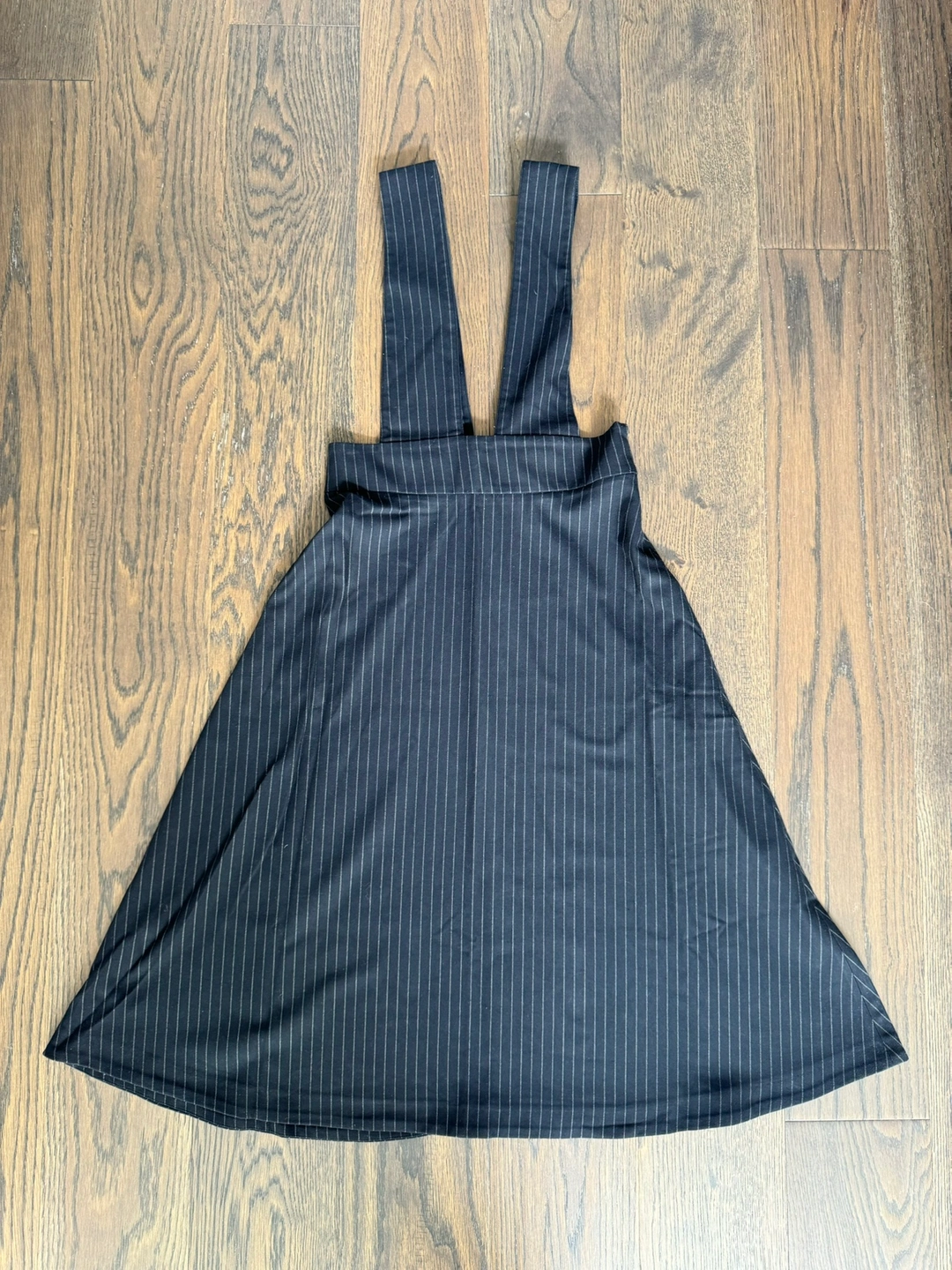 This is a black and white striped overall dress. It is midi length and has a fitted bodice and a flared skirt. Elastic at back waist. Side pockets. Good for Fall/winter.