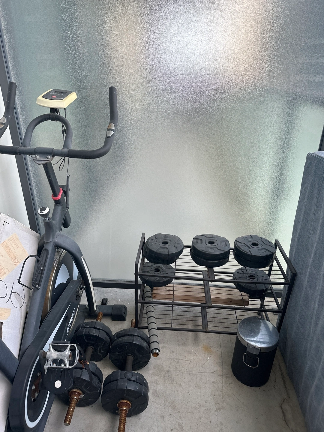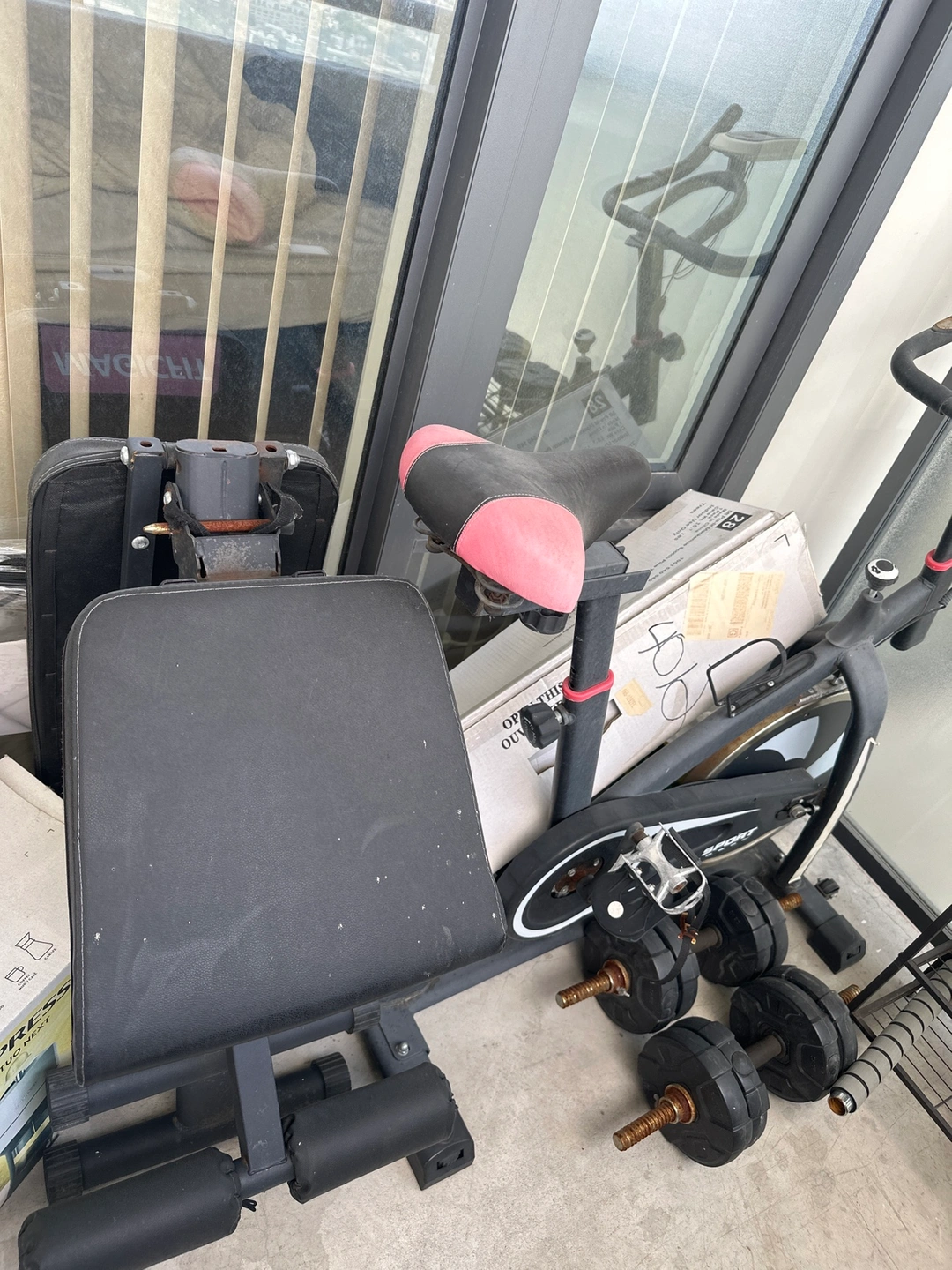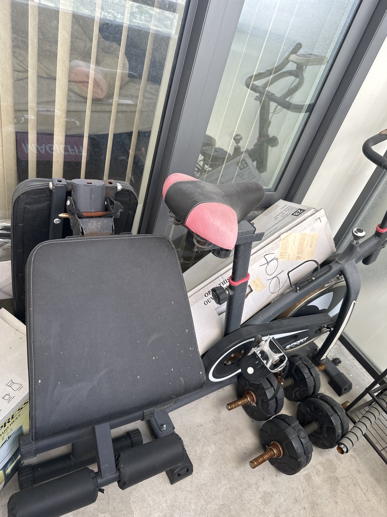 Includes a stationary bike, weights, and a weight bench. I’m willing to give all the things including bicycle and bench with the weights. People interested in taking all can contact me.