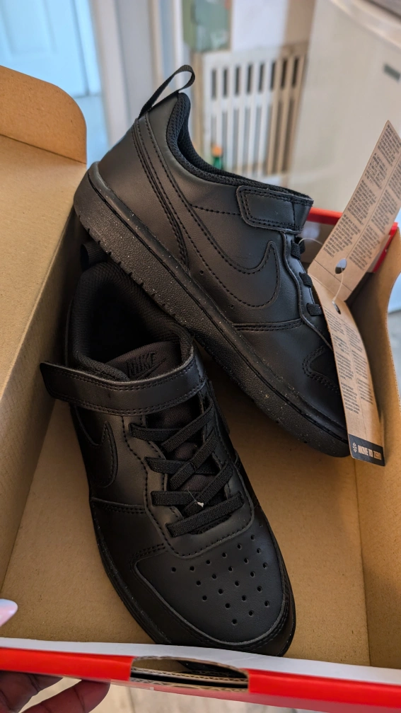 These are black Nike shoes with velcro closures. They are size 1Y (youth).