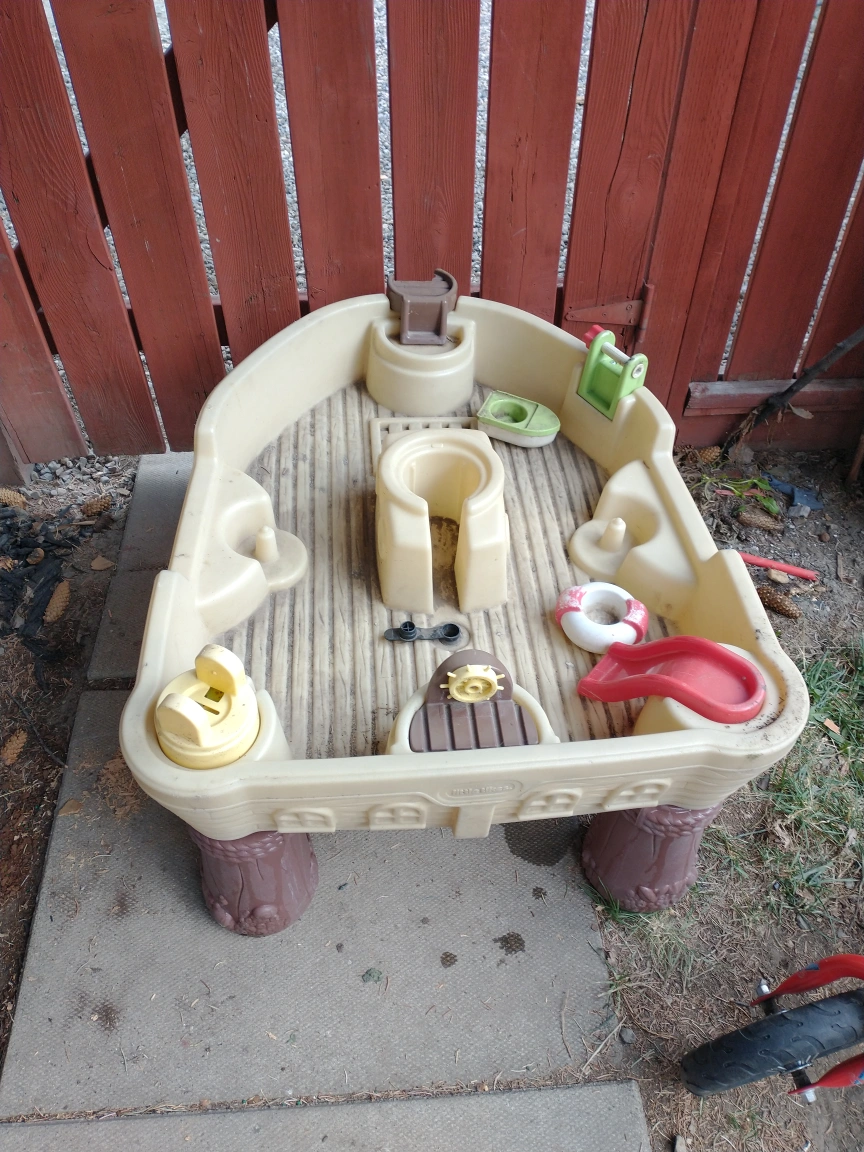 116This is a water table in the shape of a pirate ship. It is made of durable plastic and is in used condition.