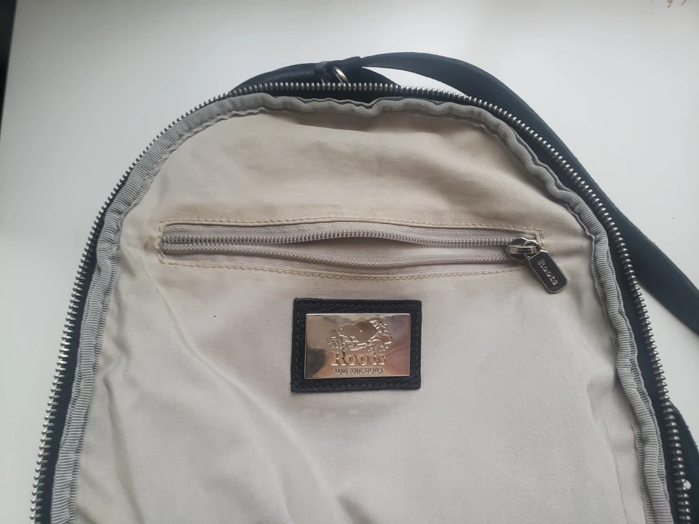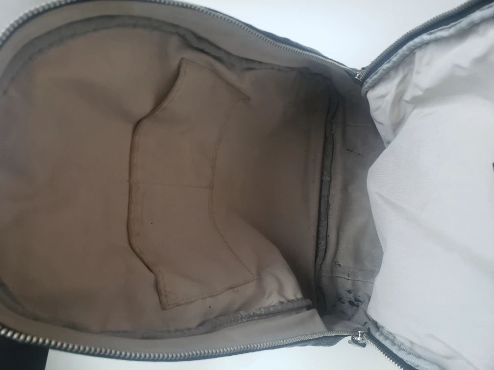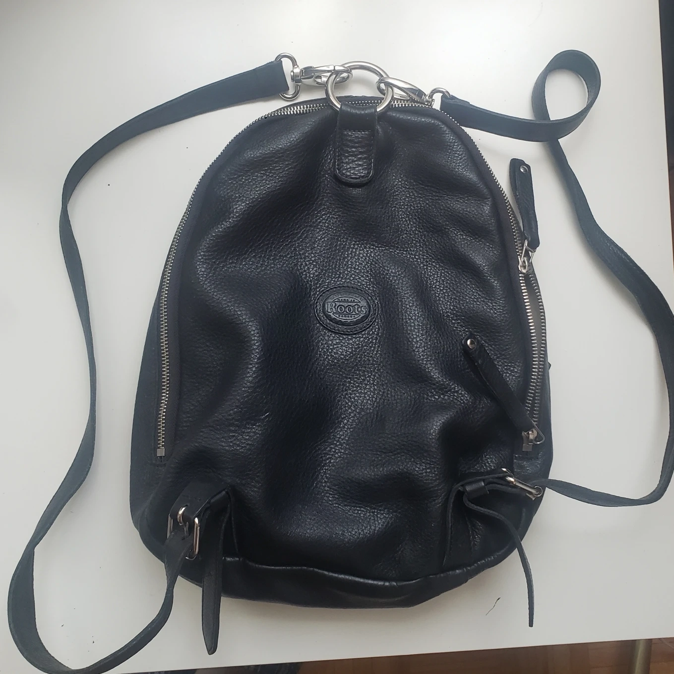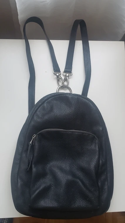Small Black leather backpack with adjustable straps. The bag is adorned with silver hardware.