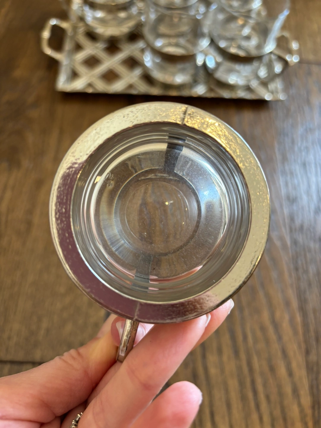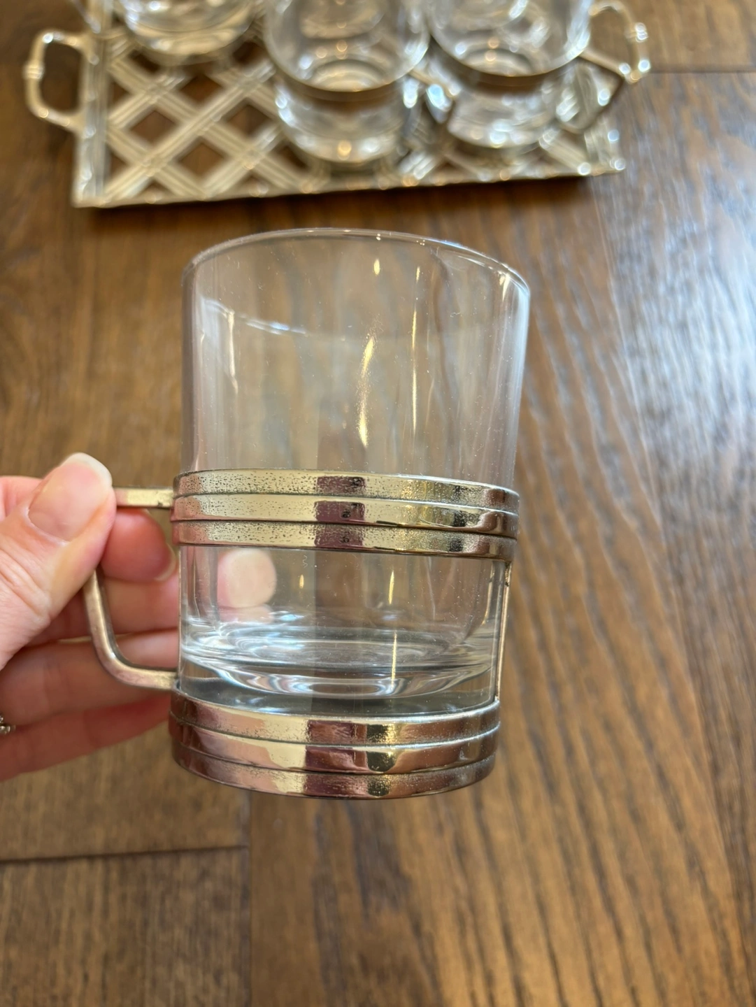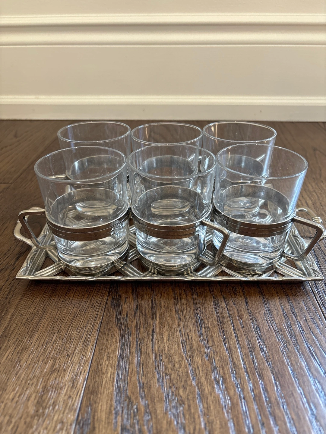 Glass tea mugs set in stainless steel case, not removable. Comes with matching tray as shown in pics. Like new. No chips in glass. Excellent condition.