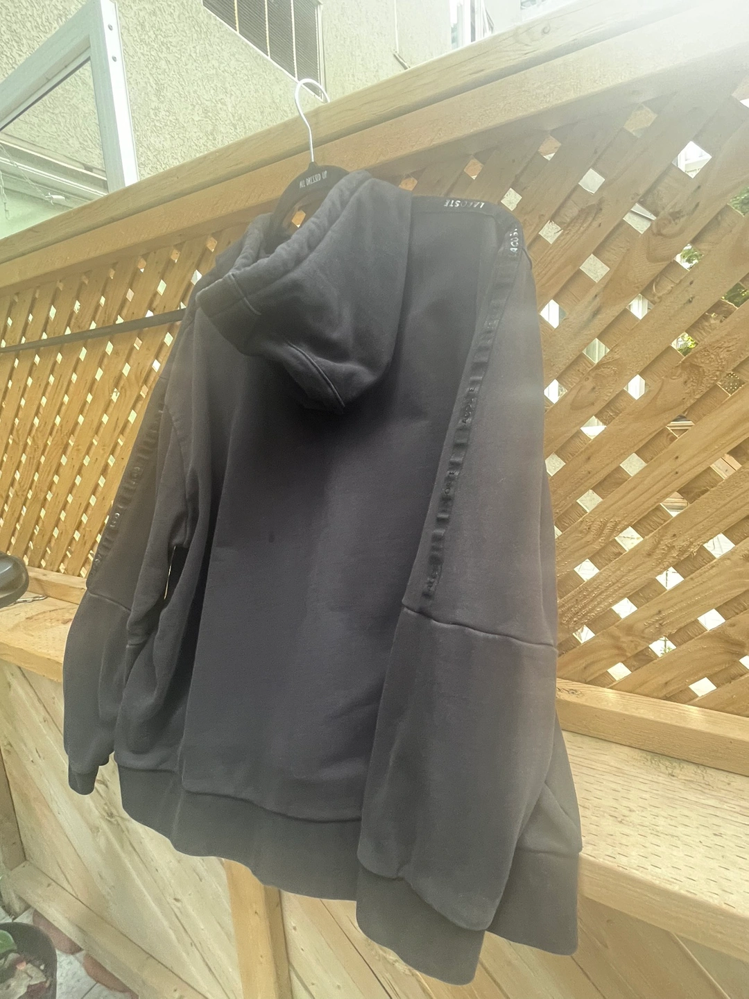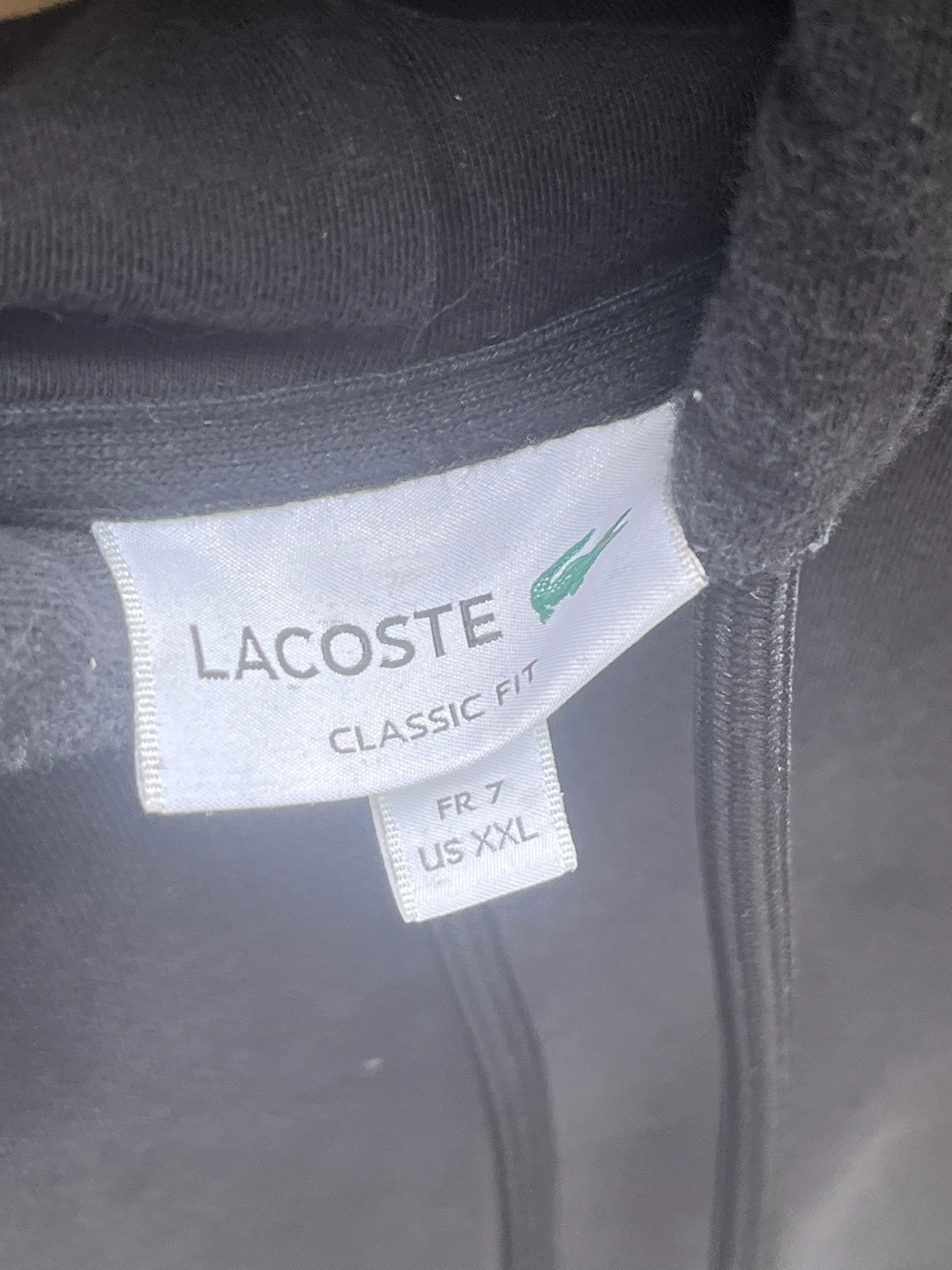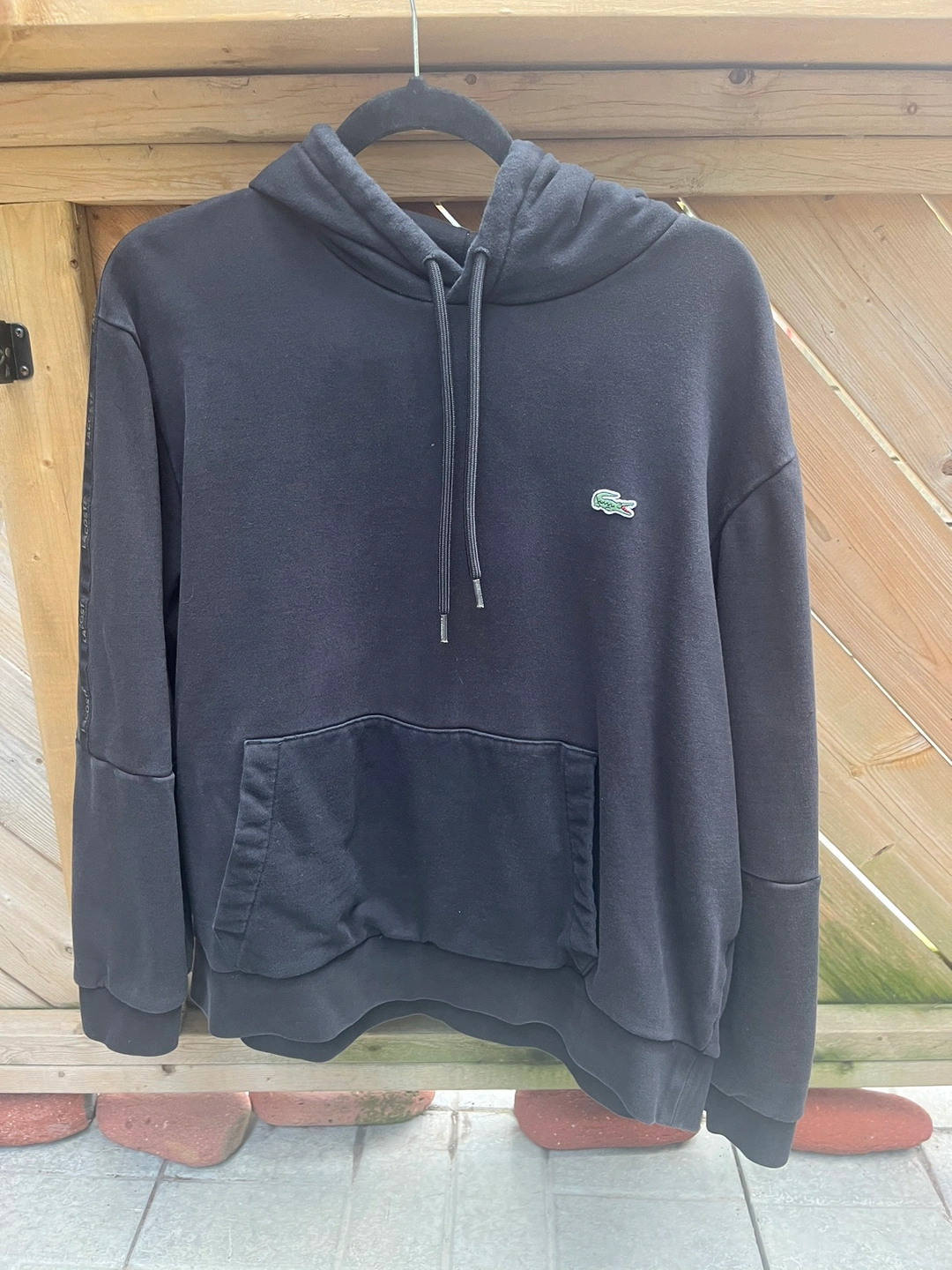 222Black Lacoste hoodie with a small crocodile logo on the front and Lacoste branding down the sleeves. It is a classic fit and has a kangaroo pocket in the front. The hoodie has a drawstring hood.