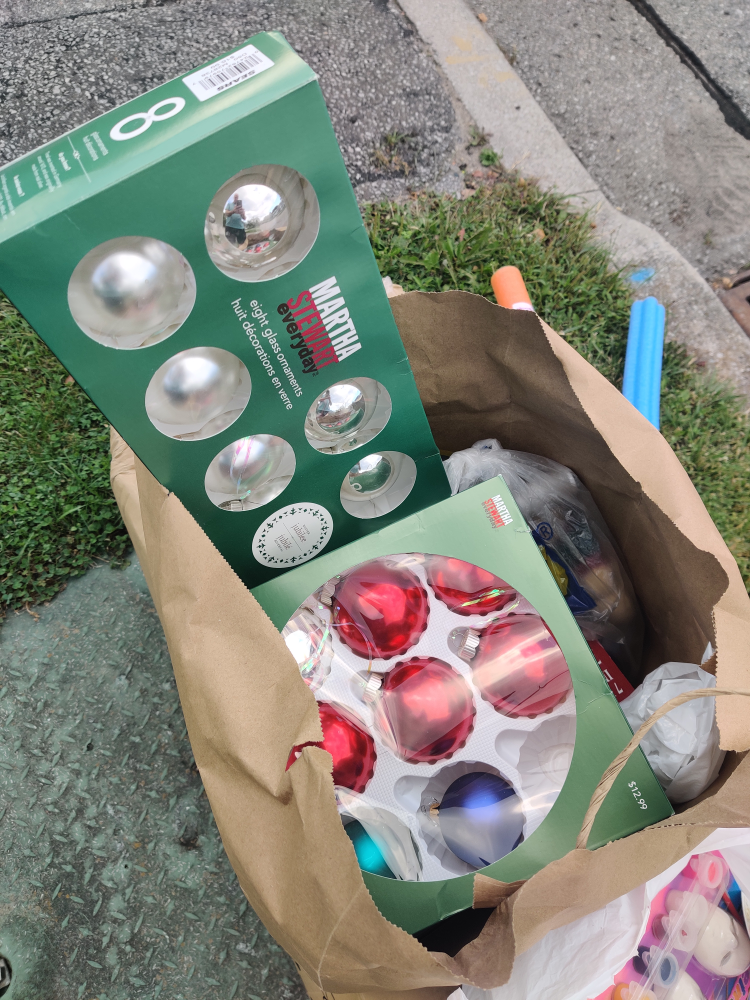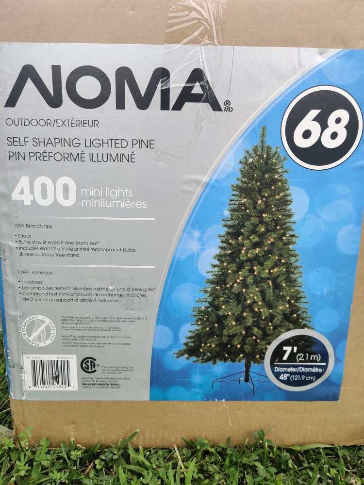 This listing includes a 7ft artificial Christmas tree with lights, and a bag of ornaments.