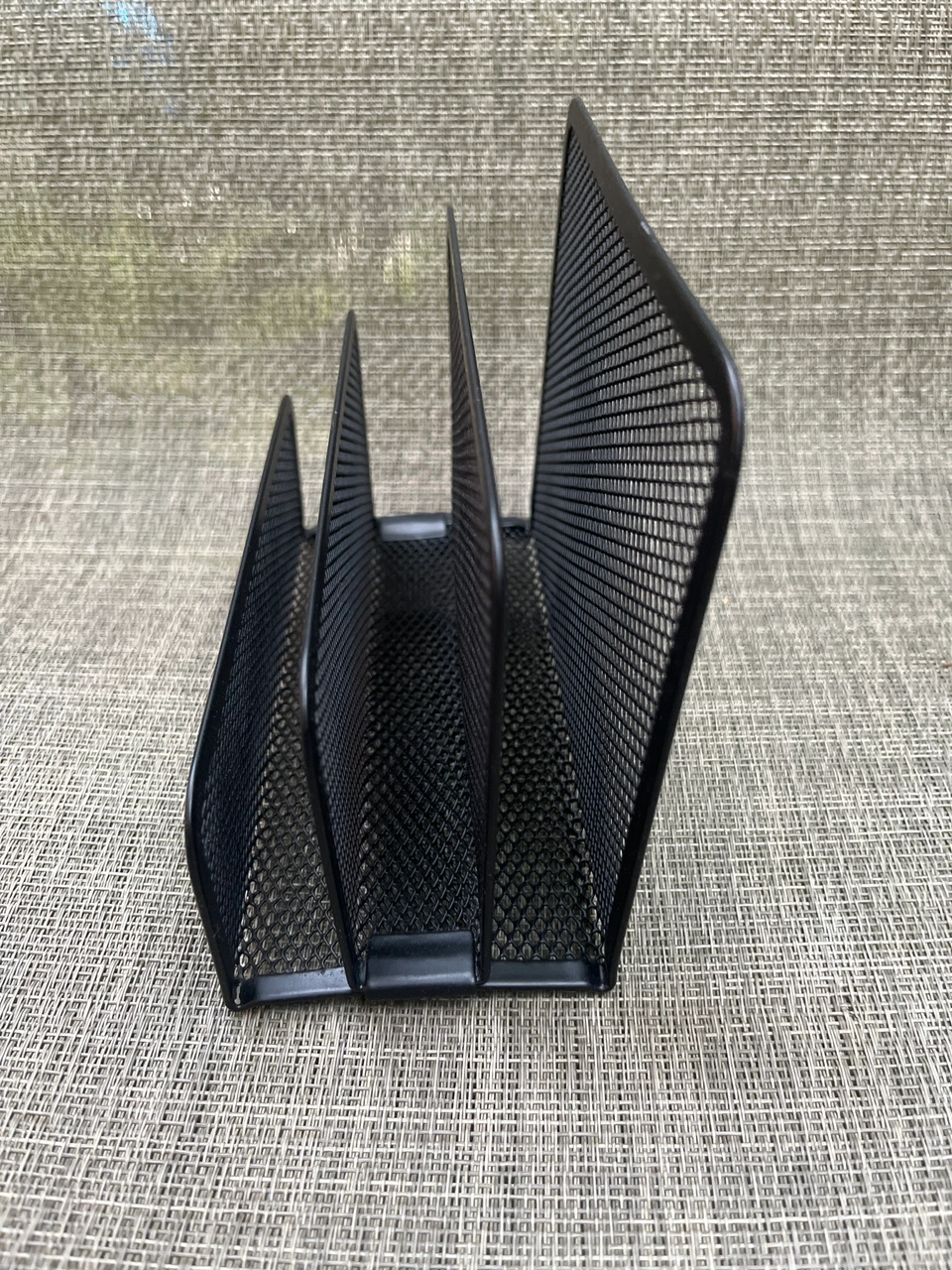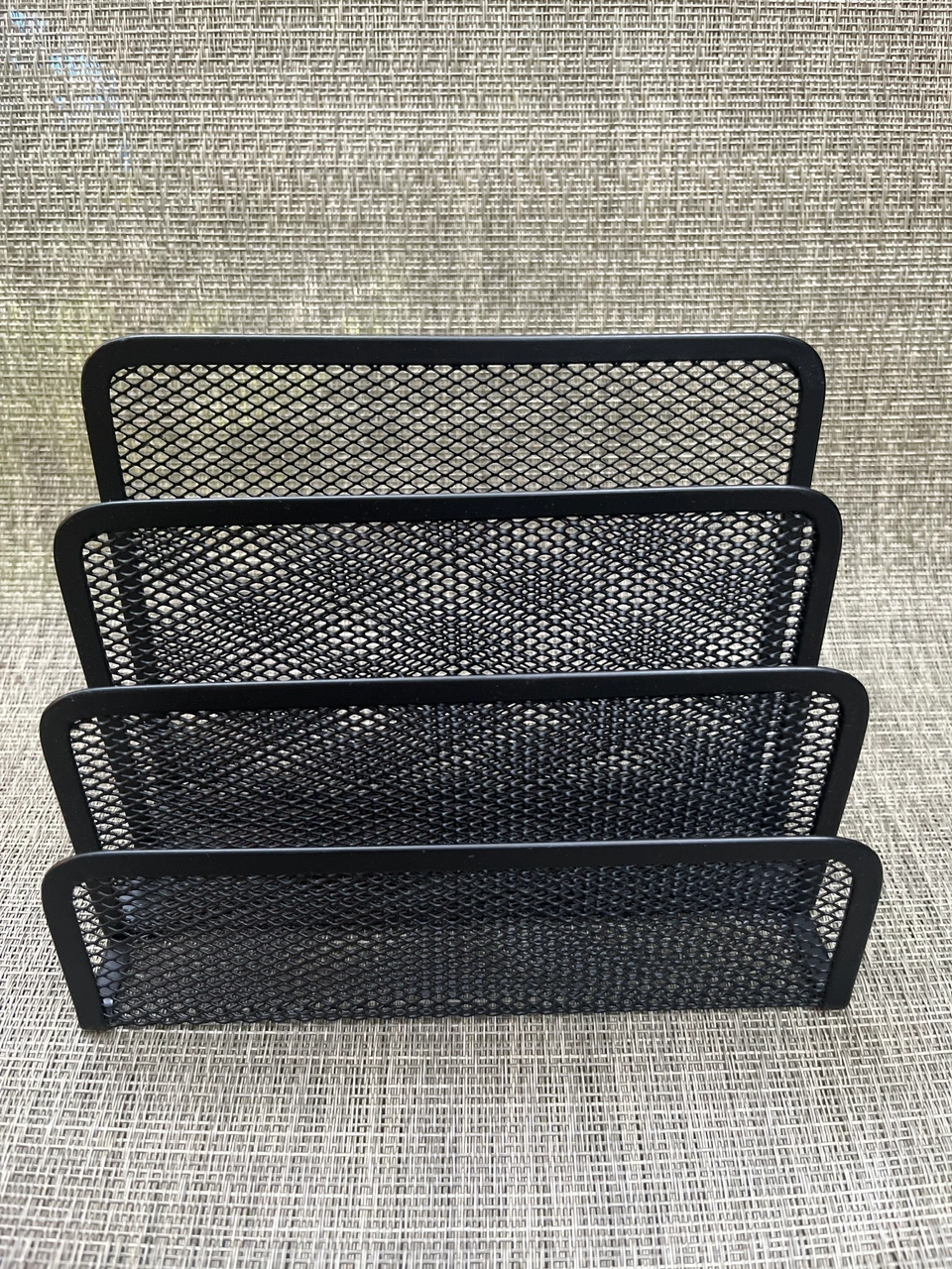 A black metal desk organizer with four compartments. It is great for organizing mail, bills, or other documents. Back to school, desk, office, teacher