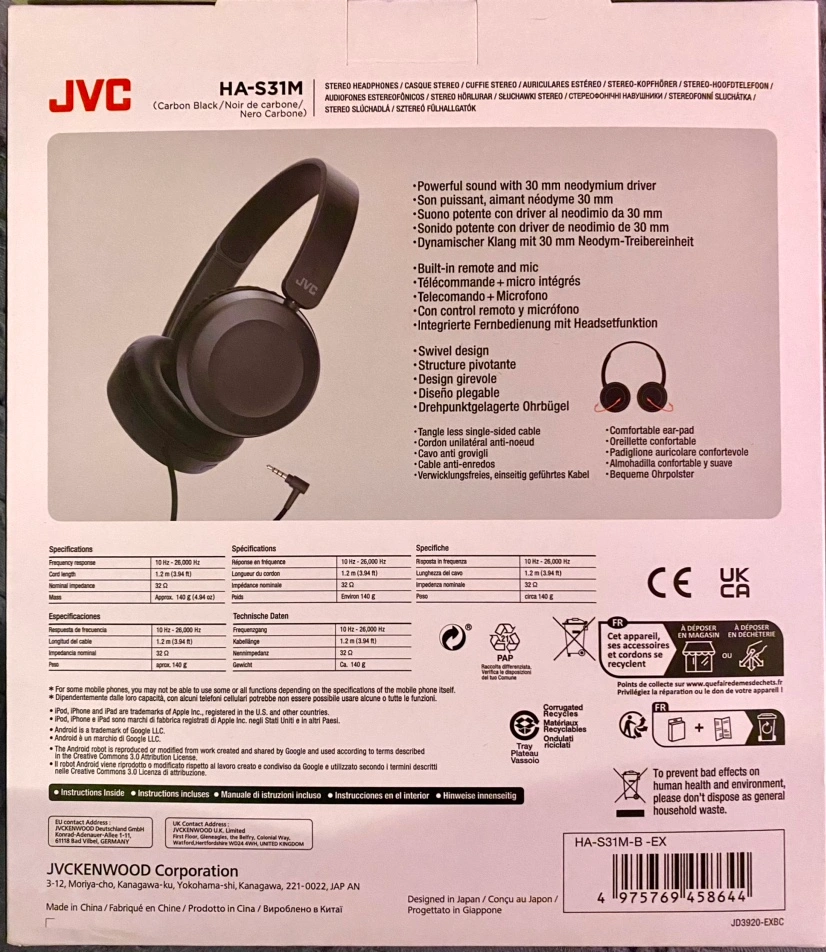 Sleek and comfortable design combined with Deep Bass powerful sound to match your style. JVC's HA-S31M on-ear wired headphones in Carbon Black will keep you entertained on the move. Control your smartphone voice assistant features to make phone calls and select music via the remote control on the headphones which includes an in-line mic.