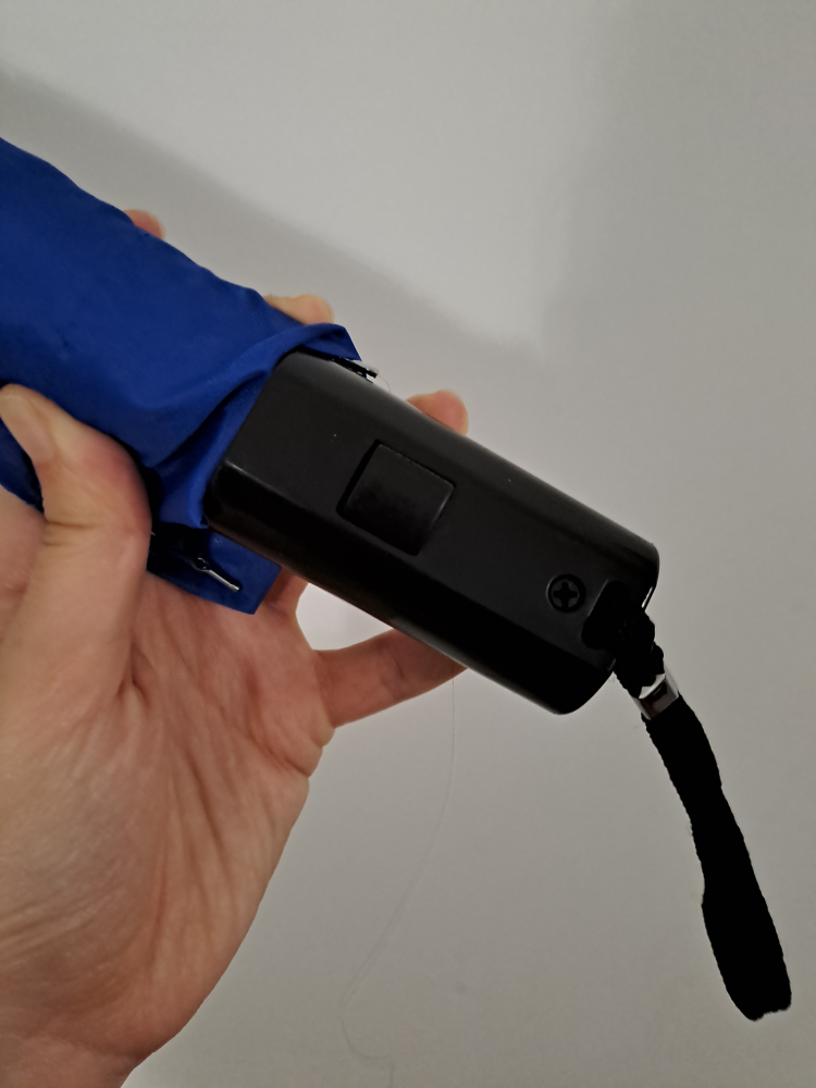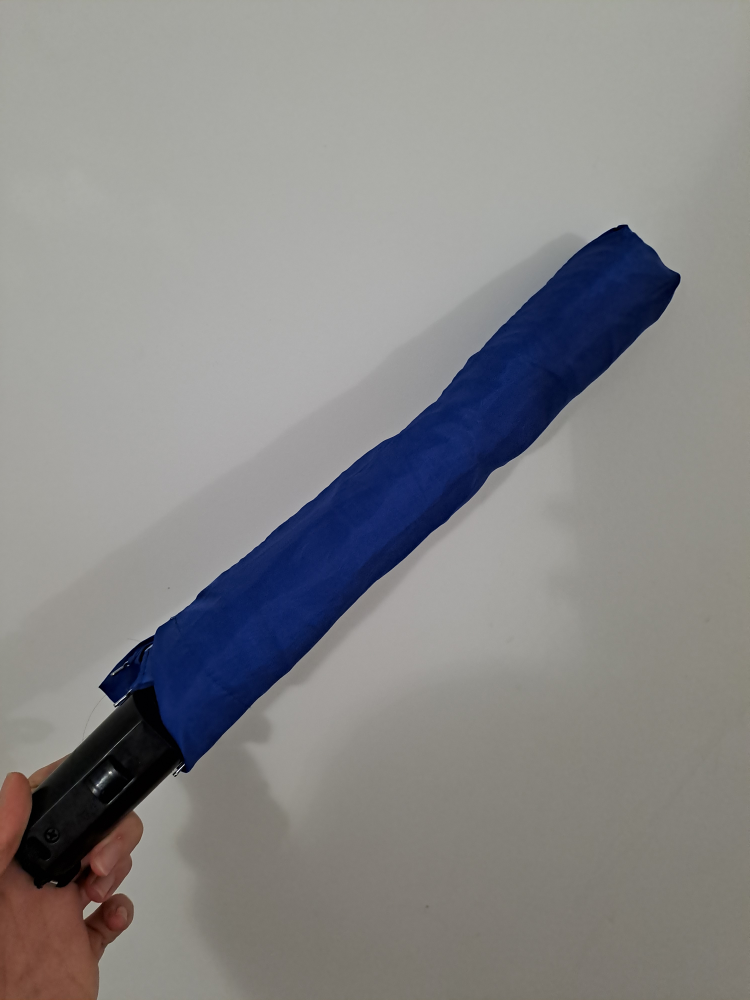 A blue compact umbrella with a black handle and a black carrying strap. Only used it for a week, don't need it anymore