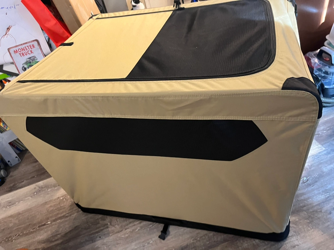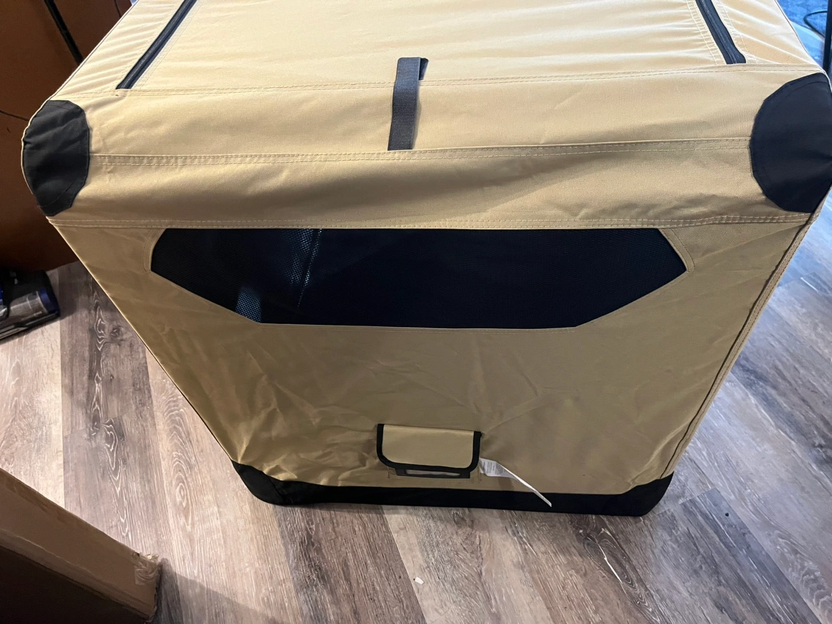 A foldable dog crate in beige and black. It has a mesh door and a zippered door. It also has a mesh panel on the side. The crate is in excellent condition as it has never been used.