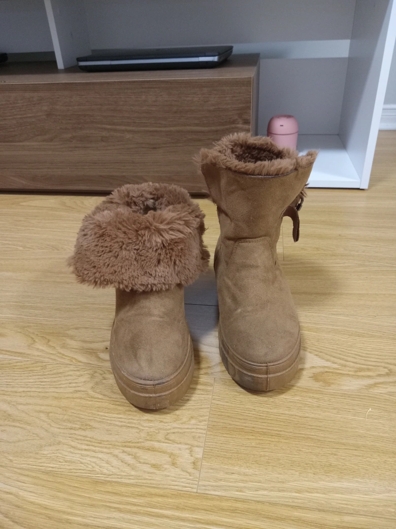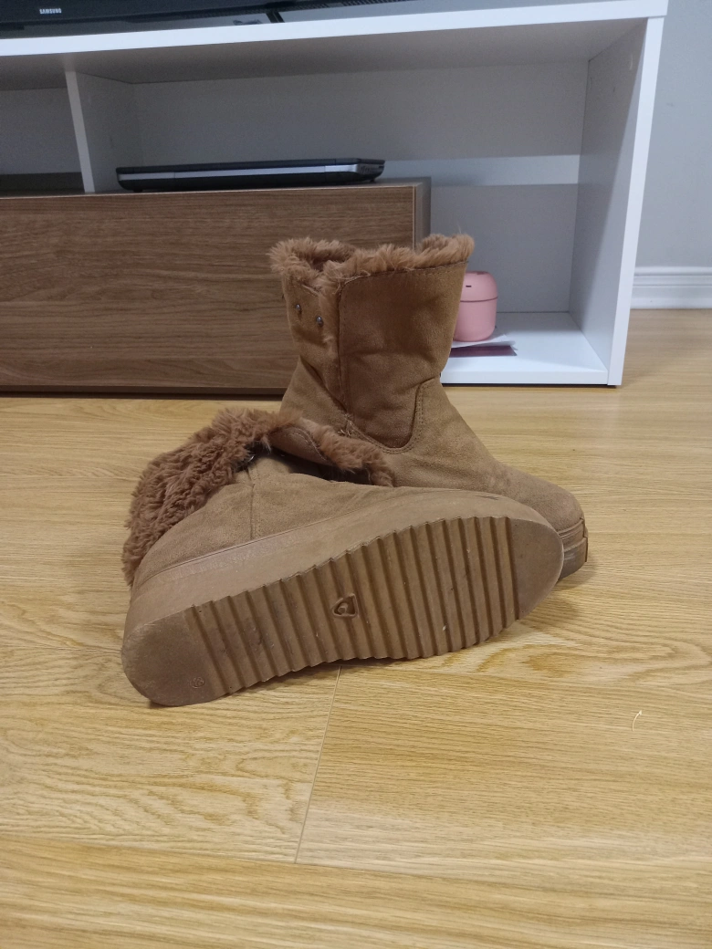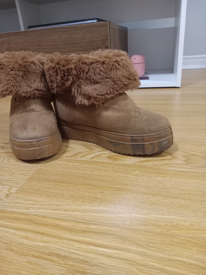 Women's brown suede winter boots with faux fur trim around the top. The boots have a platform sole and a buckle detail on the side.