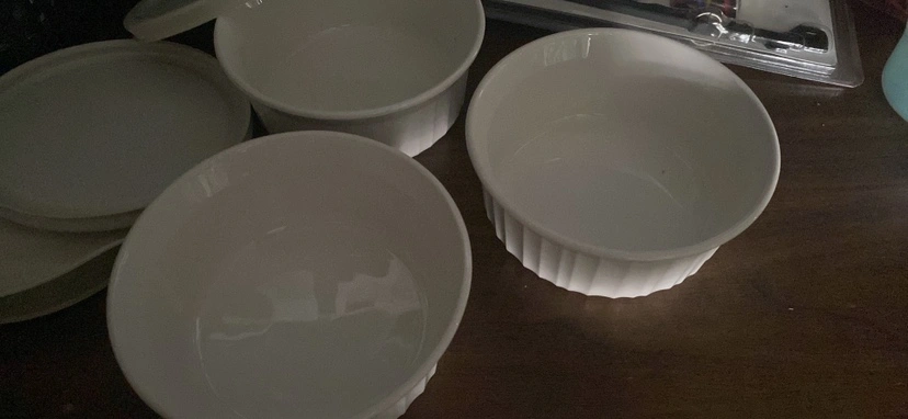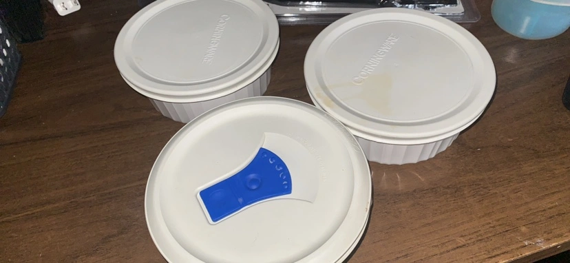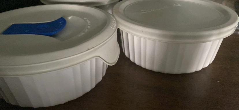 Set of 3 it’s vintage Corningware baking dishes with lids. Great for storing leftovers or serving individual portions.