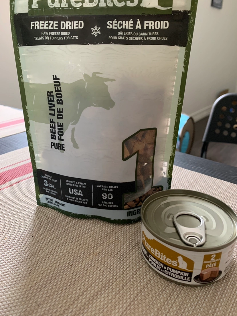 One bag of PureBites Freeze Dried Beef Liver and one can of PureBites Chicken and Pumpkin Pate. My cat doesn’t like it… I opened the treat bag today (23/08).