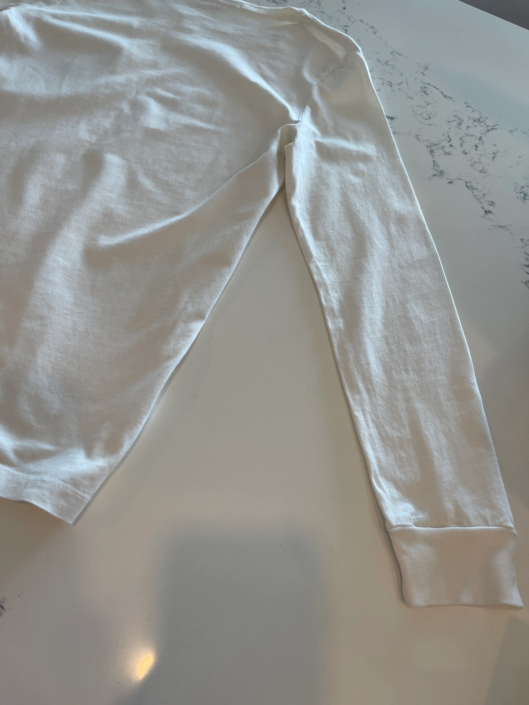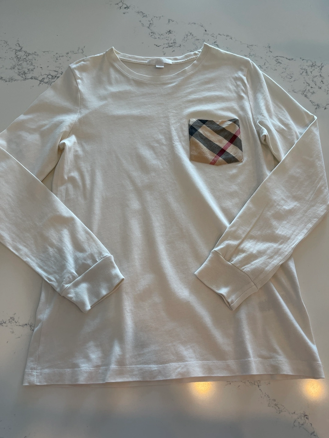 White long sleeve t-shirt with a Burberry plaid pocket.