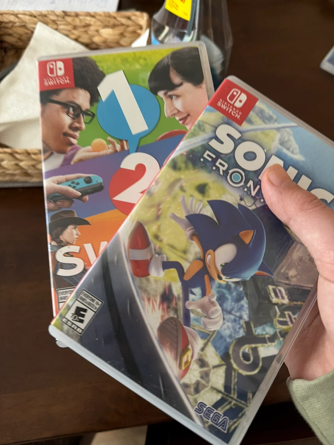 Nintendo Switch console with two sets of Joy-Cons, extra controllers, and steering wheel accessory. Includes Sonic Frontiers and Mario Party Superstars games. It's ready for gaming fun!