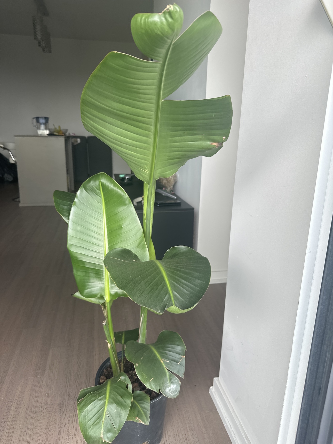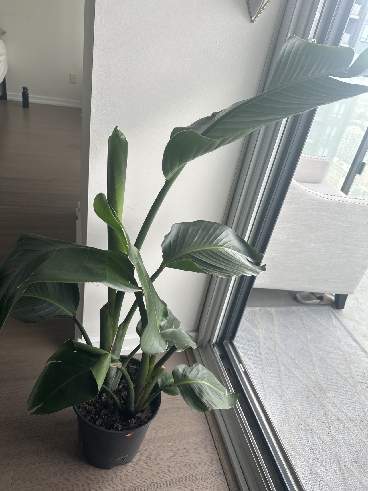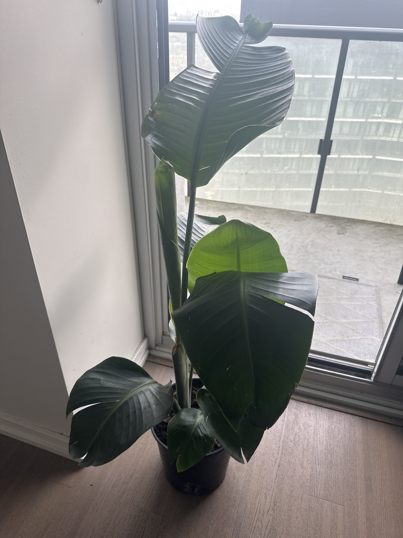 Large, healthy Bird of Paradise plant in a black pot. The plant is approximately 3 feet tall. Pick up only.