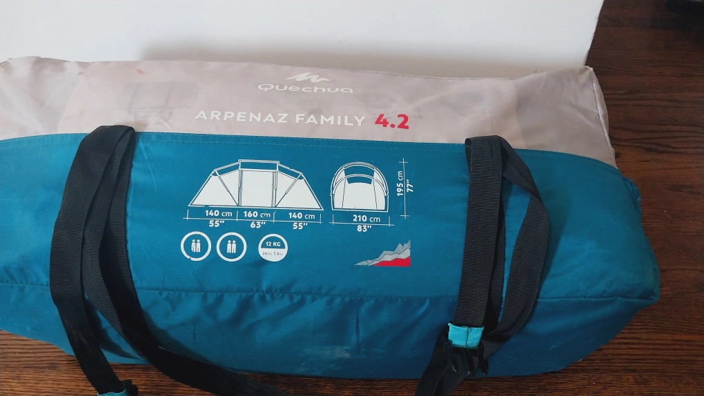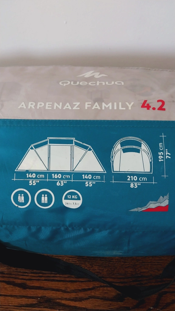 This is a Quechua Arpenaz Family 4.2 tent. It is 2 rooms tent with a large living space. The tent has a waterproof flysheet and is easy to assemble. It includes a carry bag. Was used only 1 time.