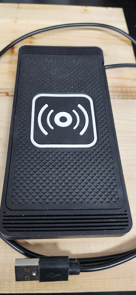 This is a wireless charging pad with a USB cable. It is black in colour and has a textured surface. It has a white symbol on it.