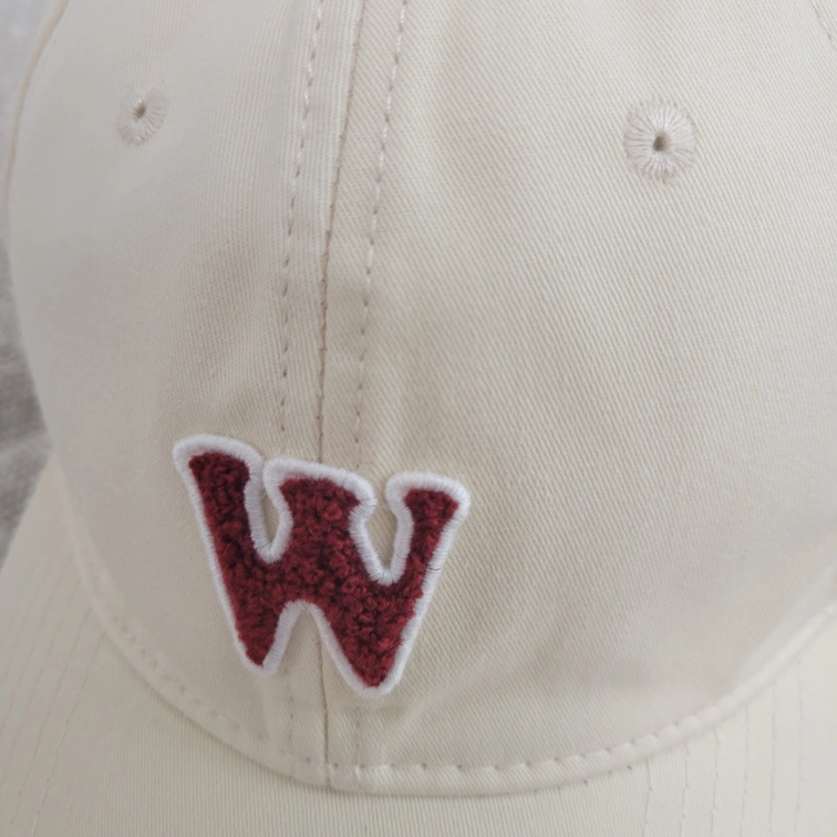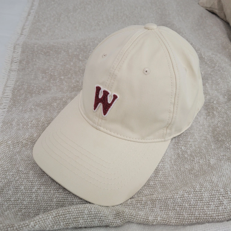 A fashionable baseball cap with a red embroidered W on the front. The cap is in a neutral white colour.