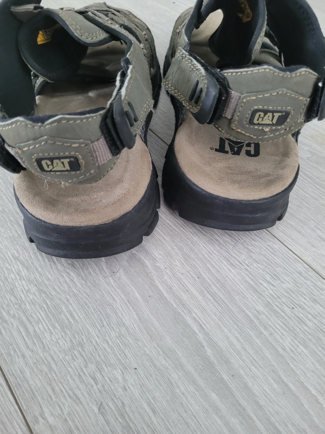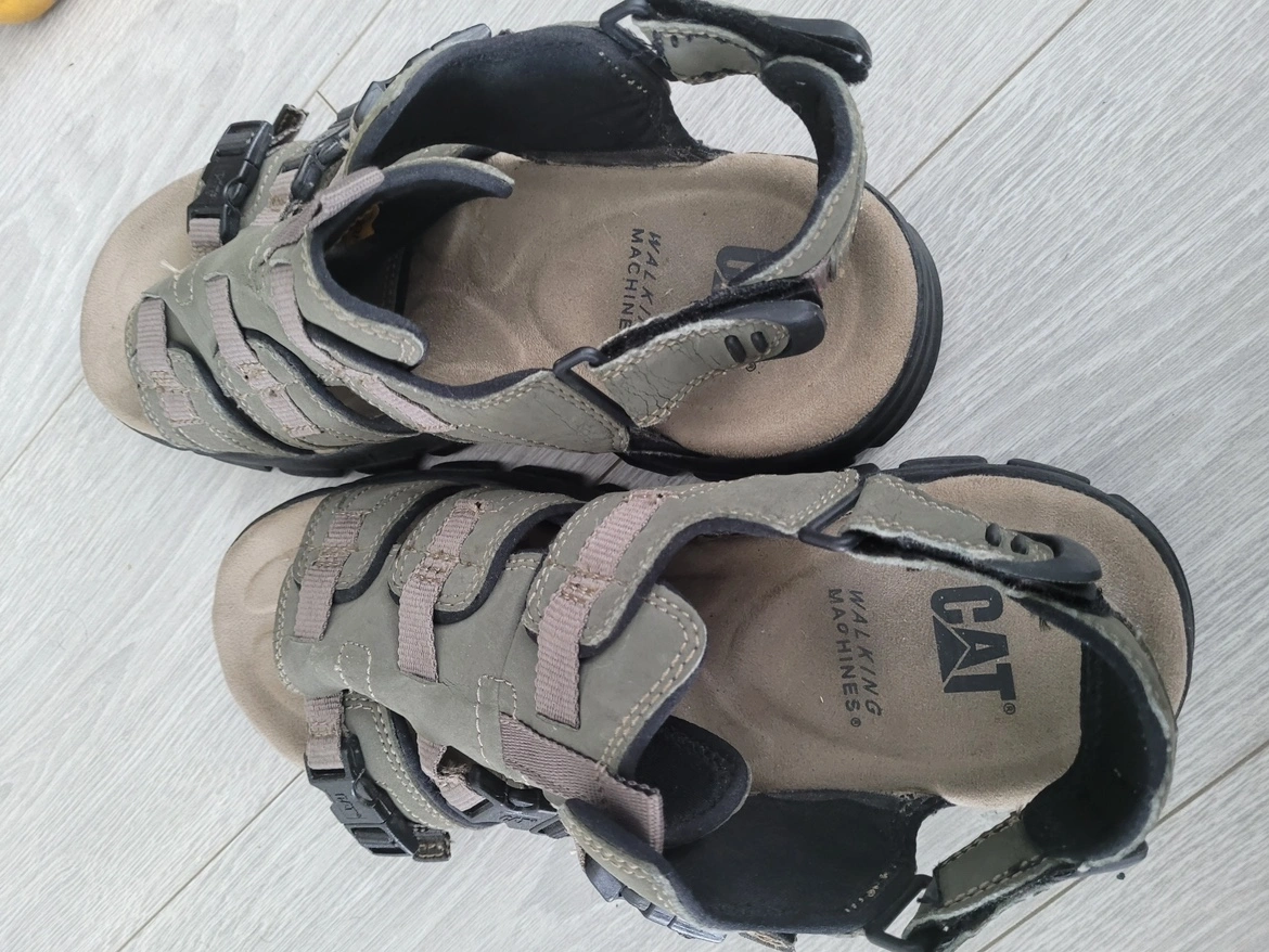 Grey leather sandals with black buckles and a chunky sole. They are in good condition and comfortable to wear.
