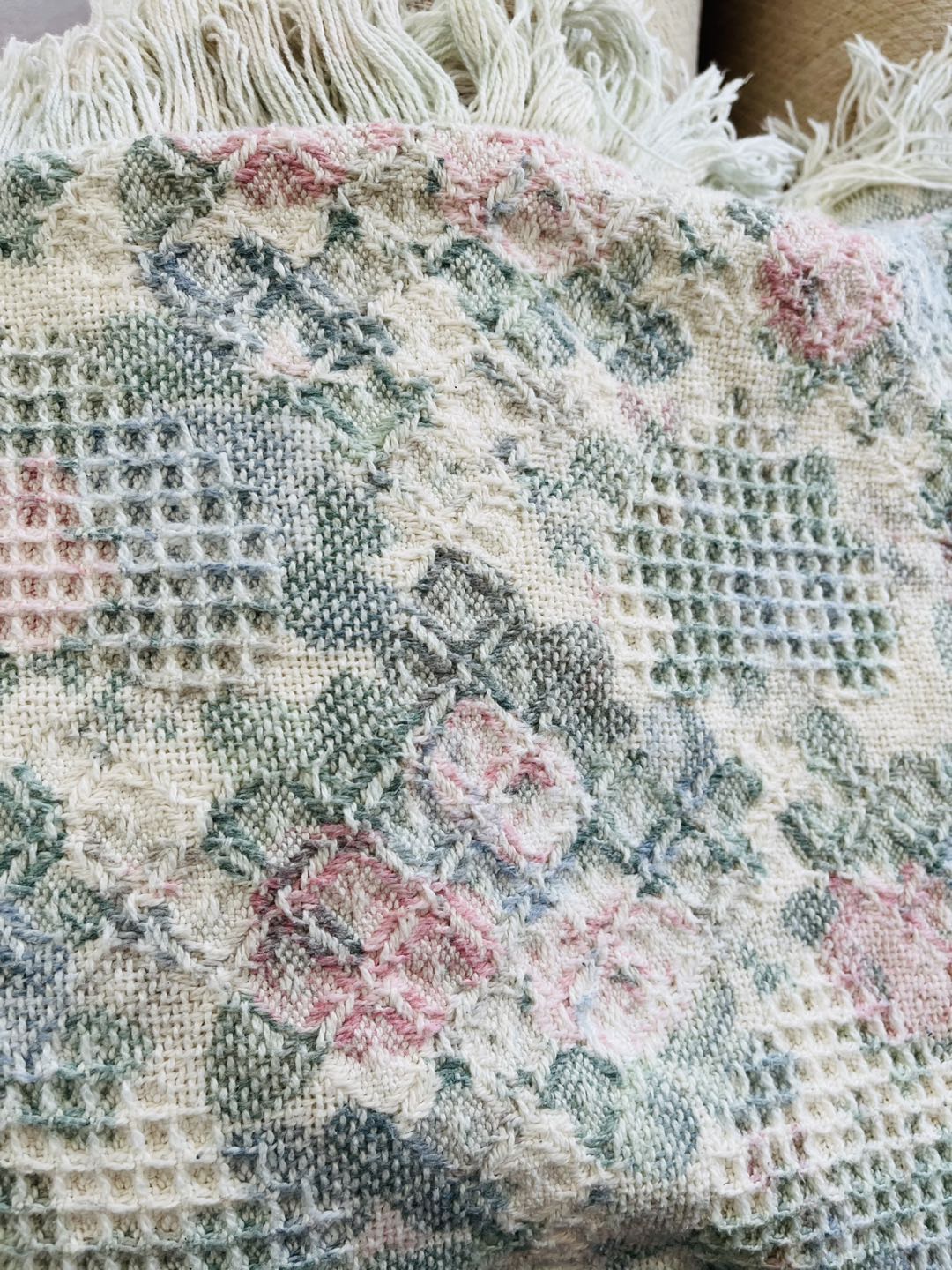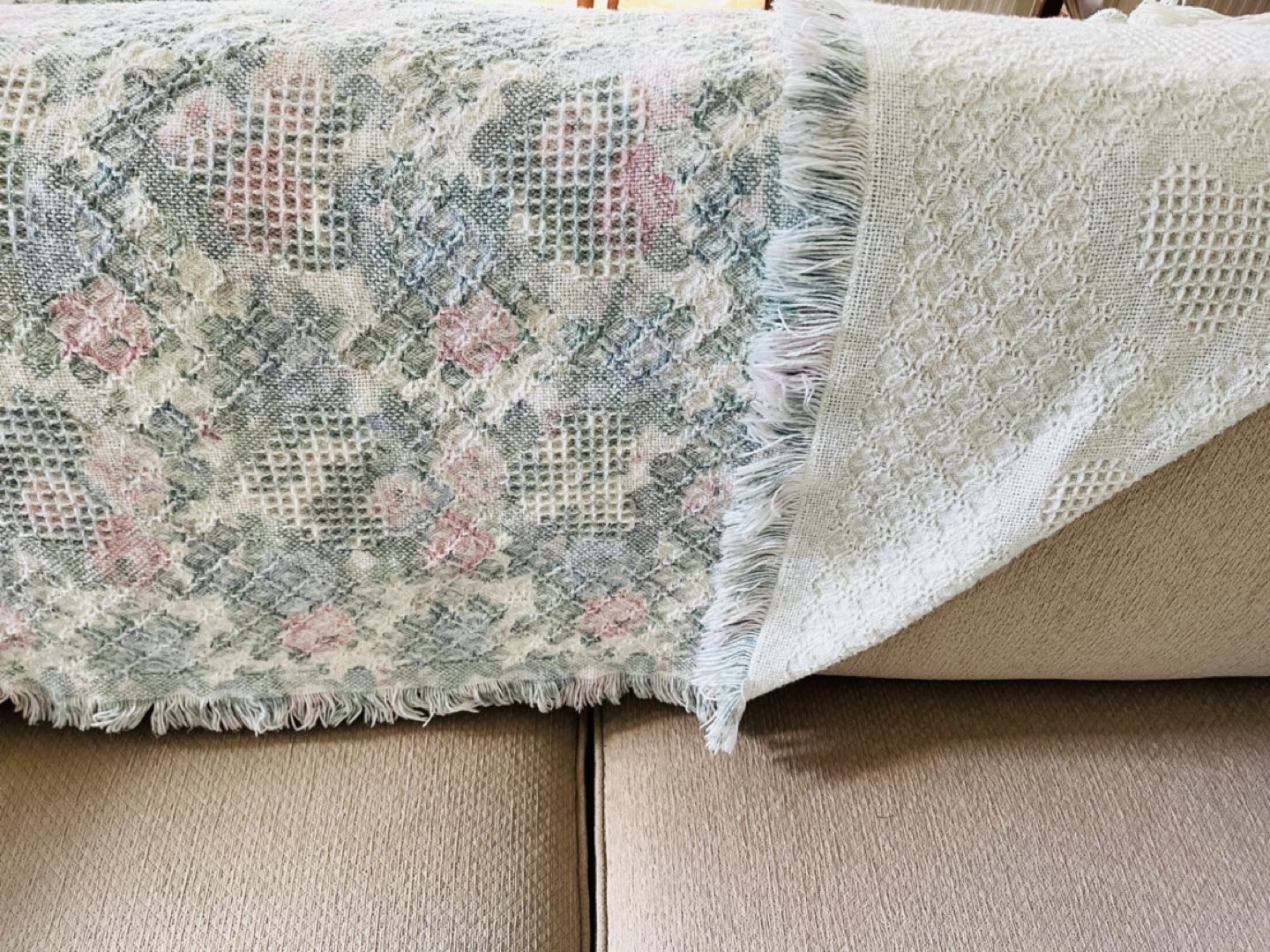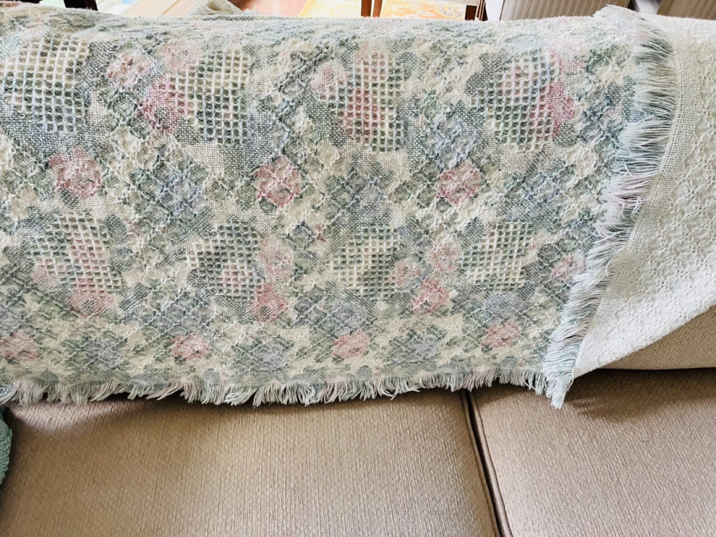 Throw blanket no rips tears or stains, freshly washed , seldom used. Smoke/pet free. Reversible cream on one side, mixed light green, blue, cream and pink on other side. Waffle knit pattern. Cotton Perfect to throw over a persons legs if in a wheelchair. Decorative for the back of a chair Approx. 58” x 60” Pickup Sheppard & Weston