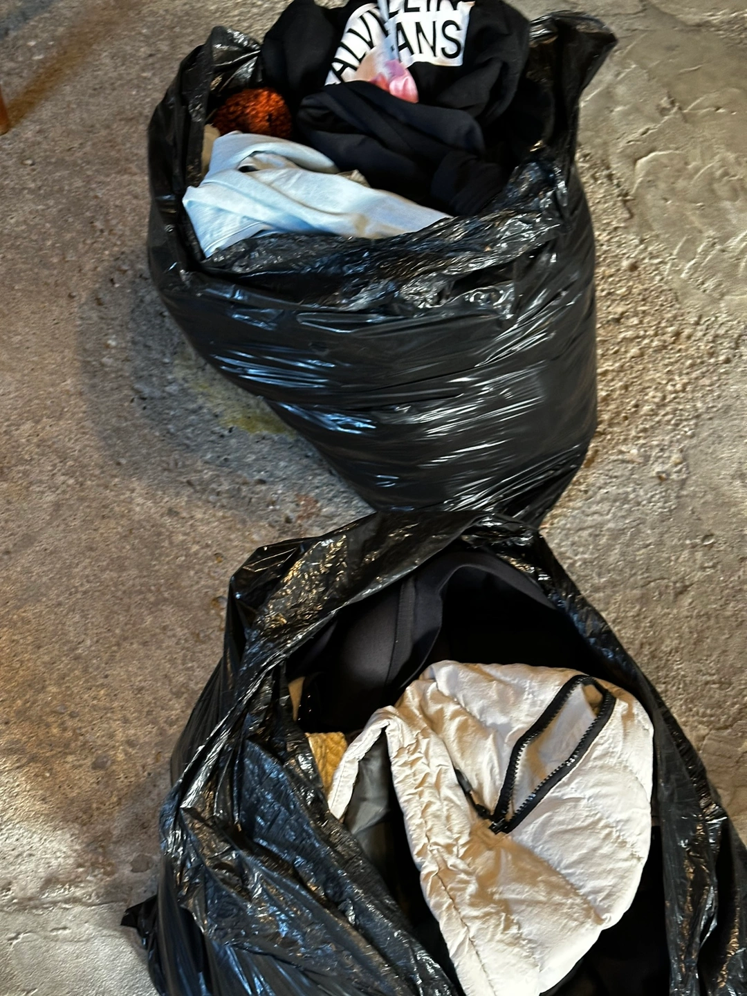 Two garbage bags filled with various clothing items. Mostly female clothing items. And some males. Both of medium size.