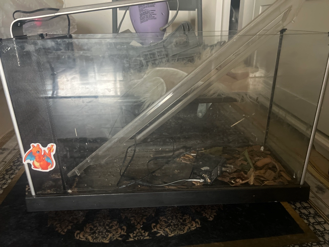 A glass terrarium with a black base, a sliding top, and a mesh side panel. There is a Charmander sticker on the side.