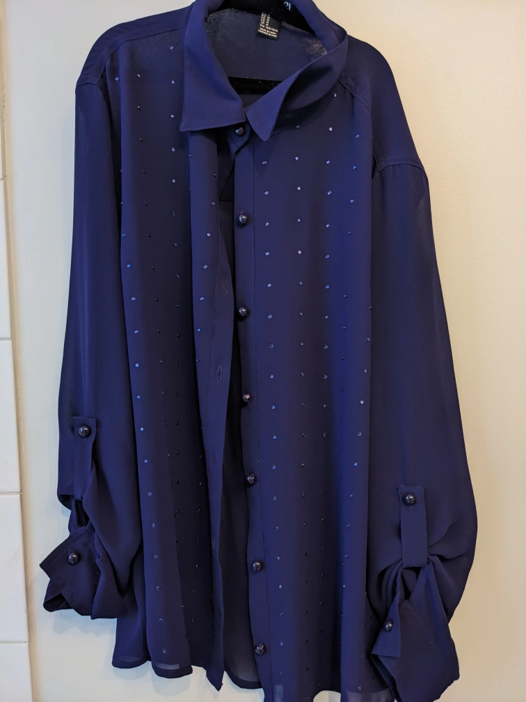 This is a beautiful navy blue blouse with not exactly sequins but has these sparkly plastic crystals. It has a collared neckline and long sleeves. The blouse is made of a soft and comfortable material. It is in good condition.