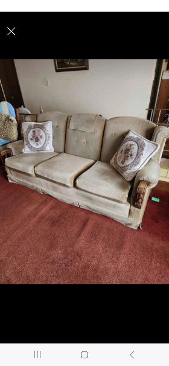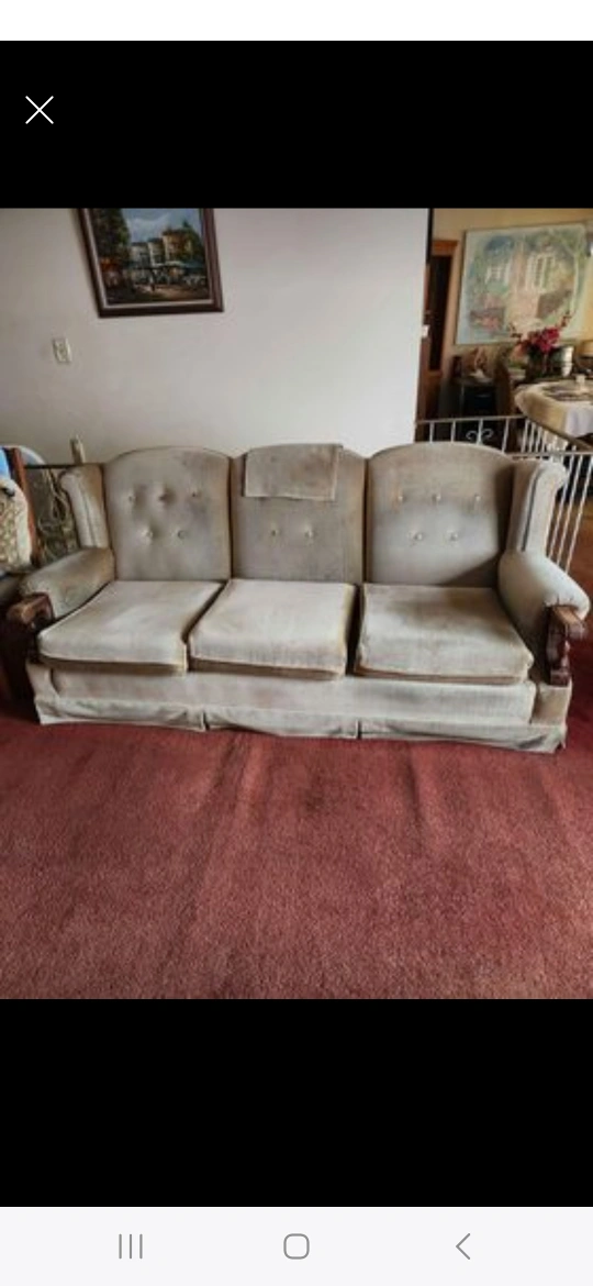 Three-seater sofa with wood arms and legs. It has a light brown fabric with tufted buttons. comfortable. Located near Quilchena elementary school in Richmond