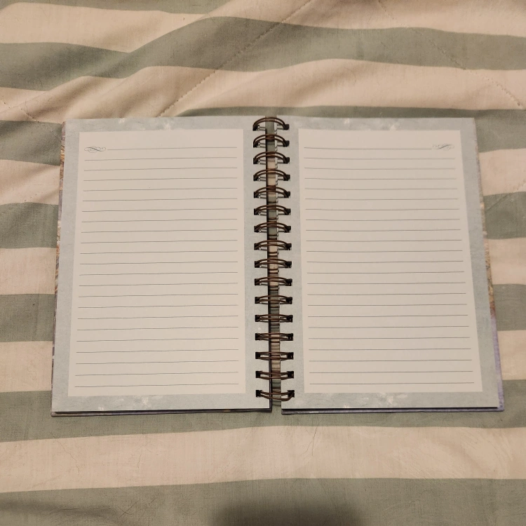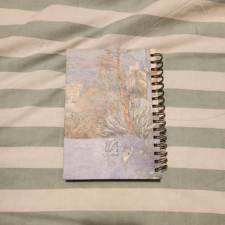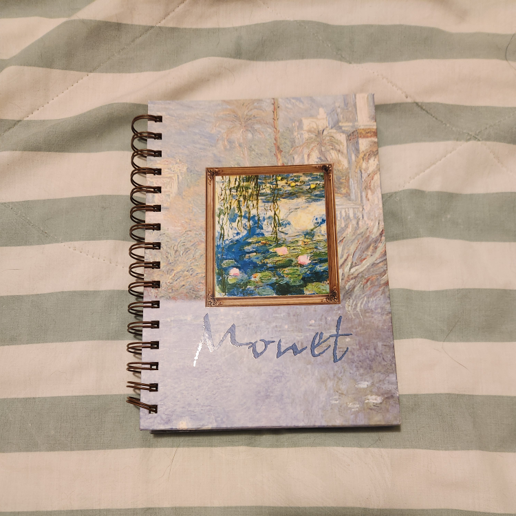 Spiral bound notebook with a Monet painting on the cover. The notebook has lined pages.