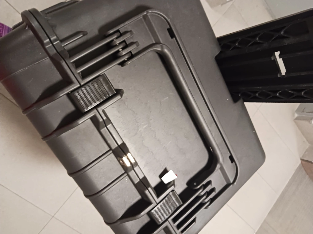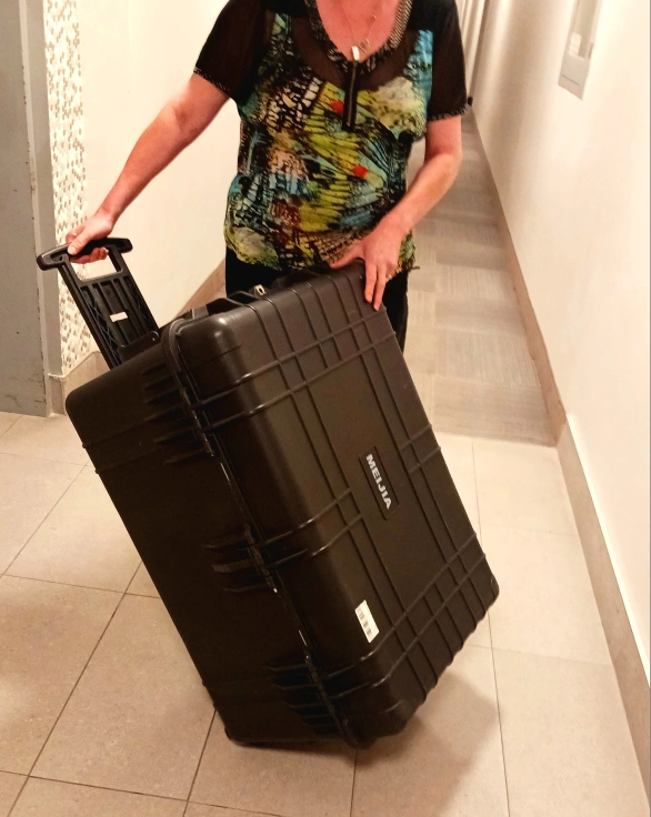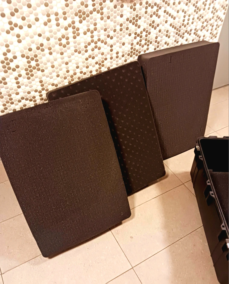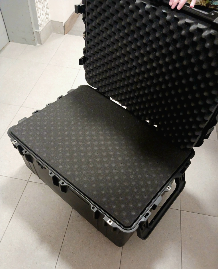 Large hard case with wheels and foam inserts.