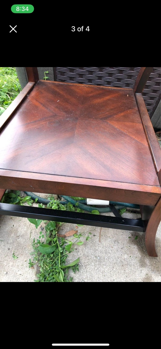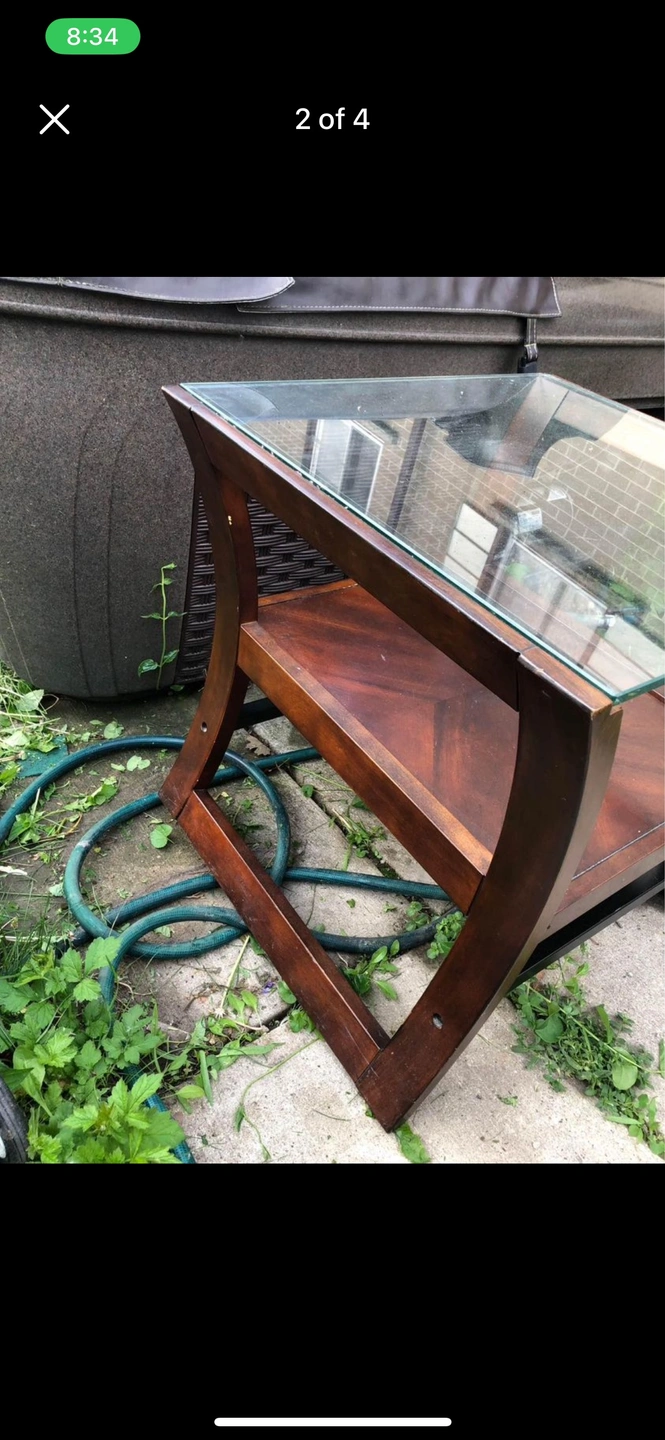 228This is a table with a glass top and a bottom shelf. It is made of wood and has a curved design. It would be a great addition to any living room or bedroom. Pick up at Don Mills Steele east area. All sales are final