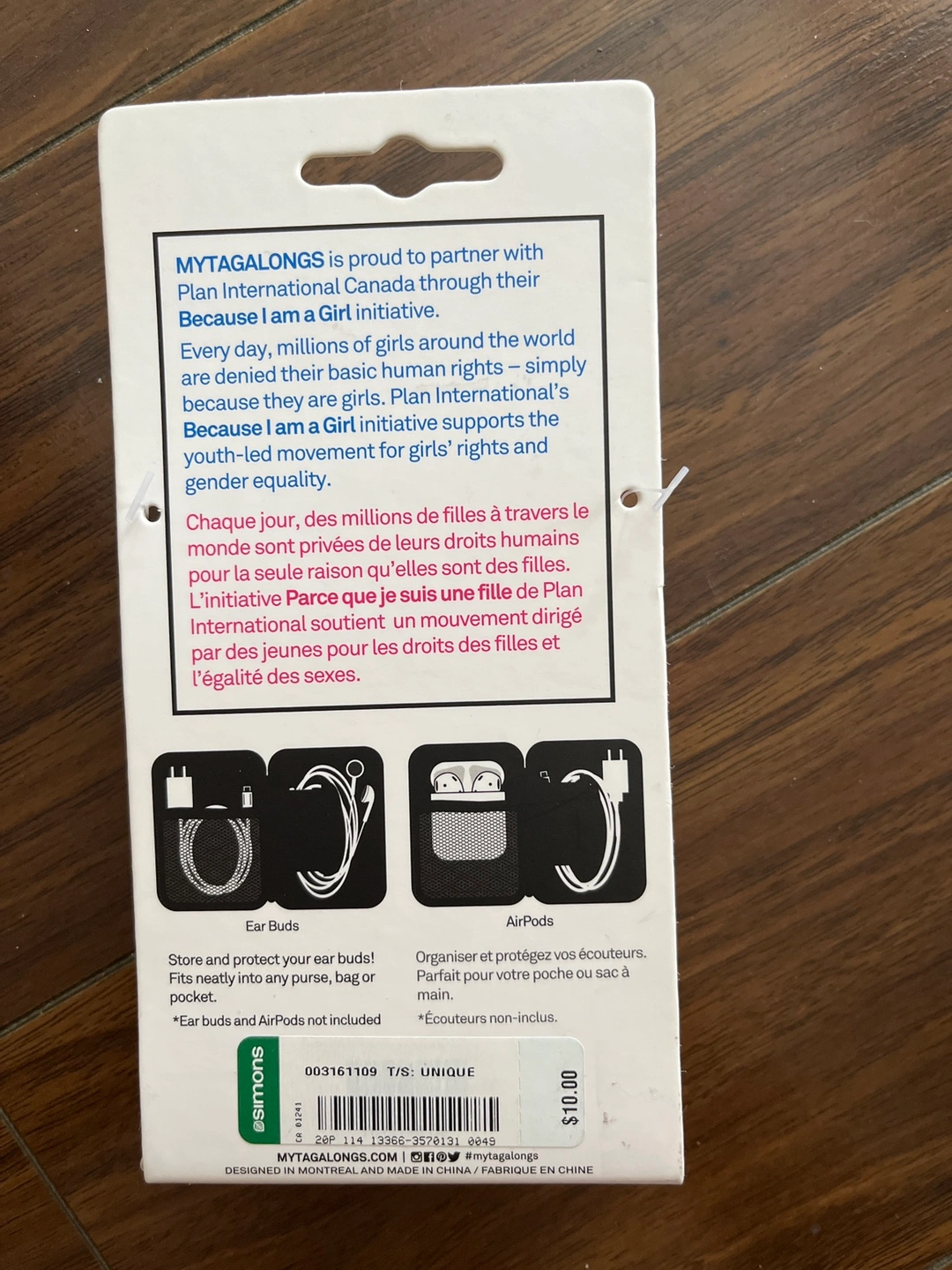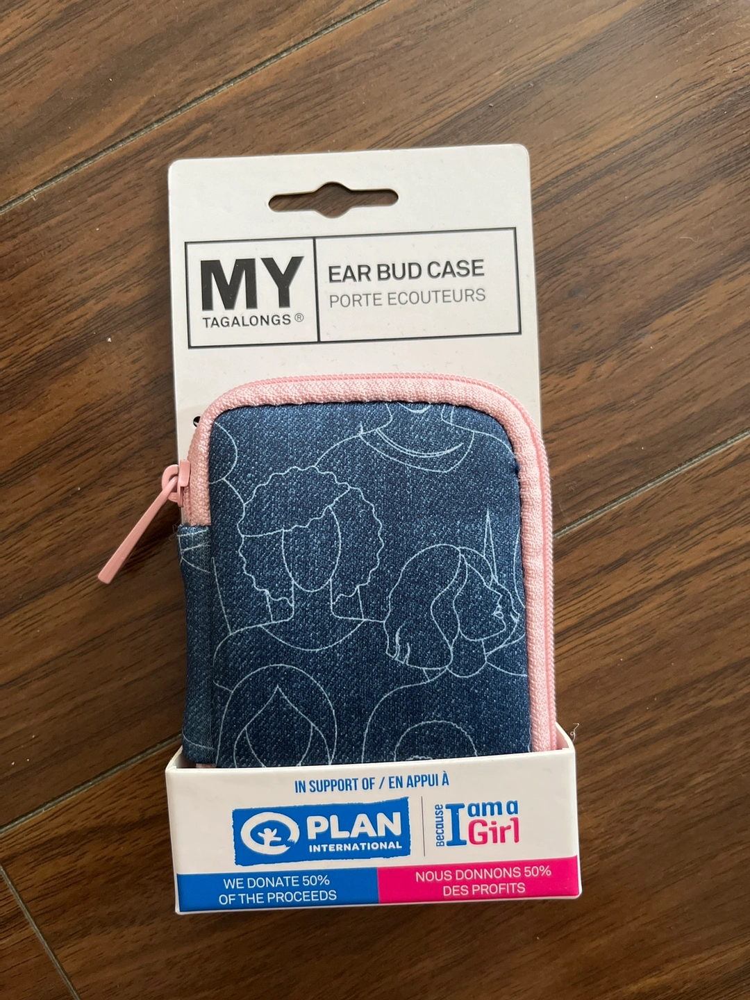 A blue and pink ear bud case with a zipper closure. It is made from a denim-like fabric. The case comes in a Plan International tag promoting the Because I am a Girl Initiative. The box features the product name, the website for the brand, and a list of features and benefits.