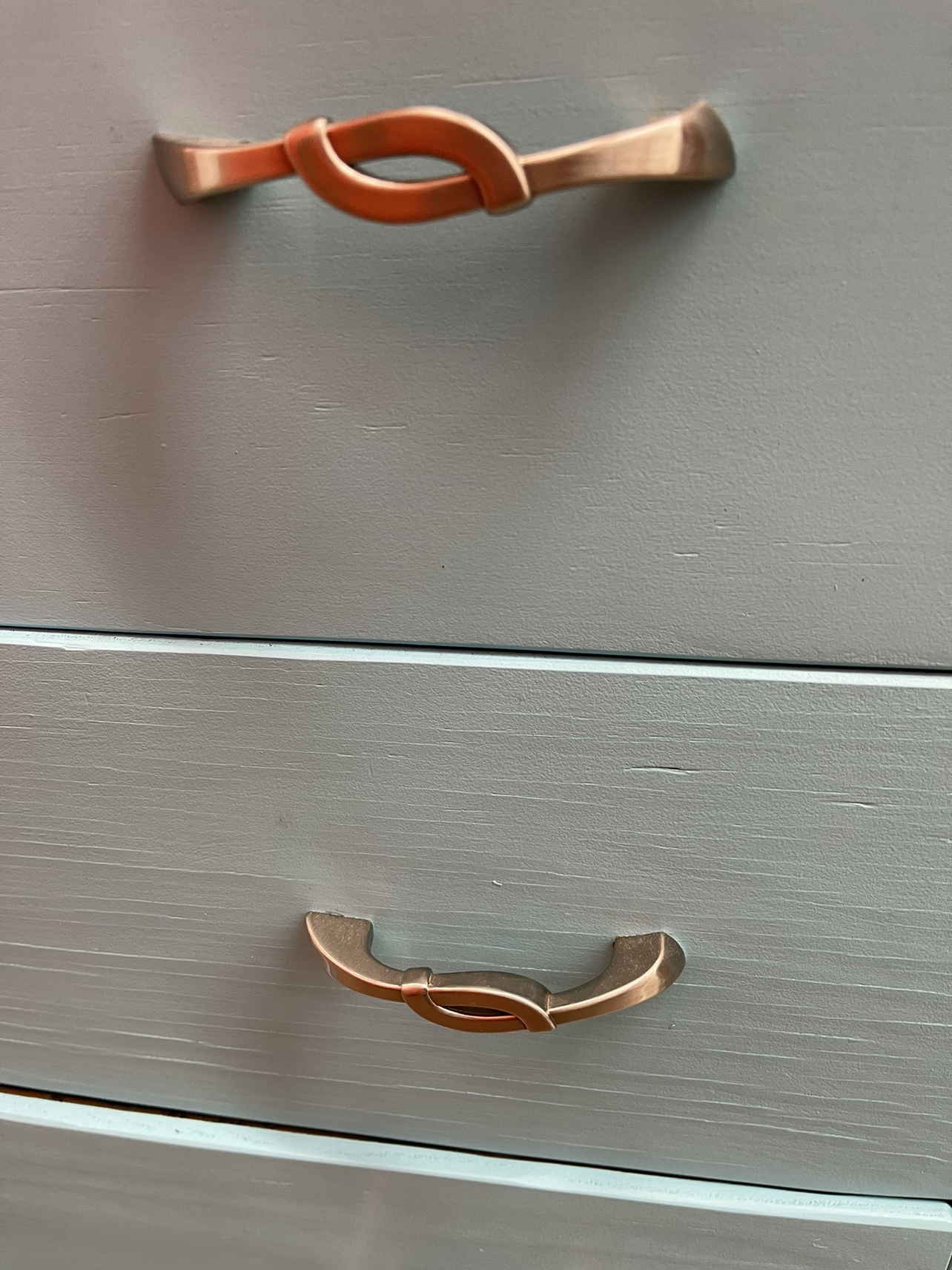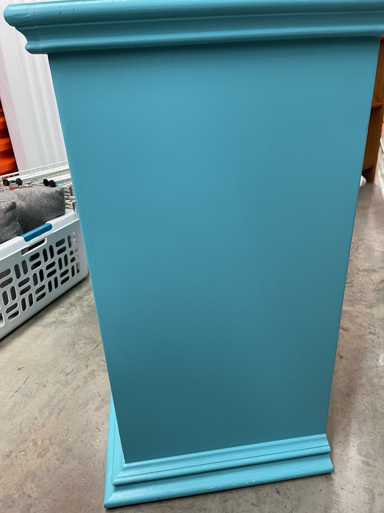 This dresser is a great addition to a bedroom, living room or bathroom. It is painted teal and features unique handles.