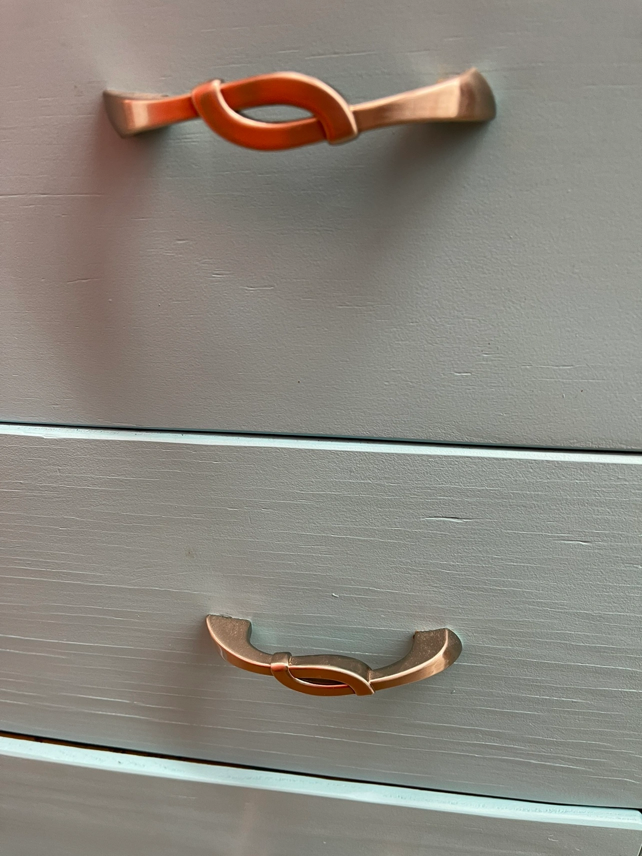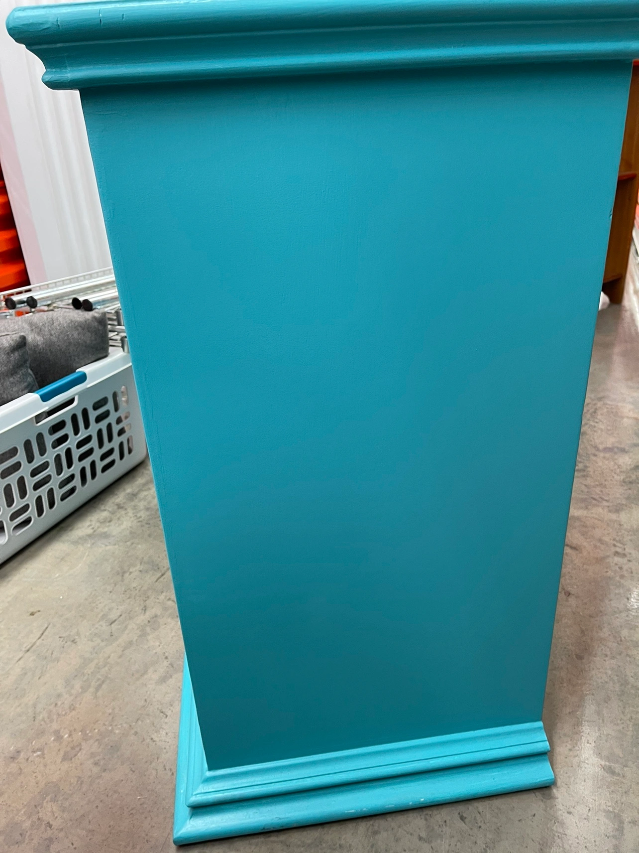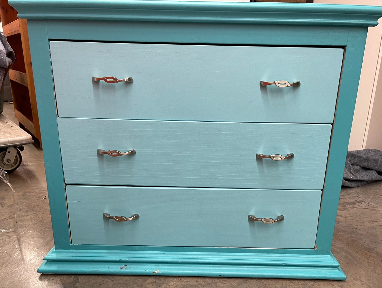 This dresser is a great addition to a bedroom, living room or bathroom. It is painted teal and features unique handles.