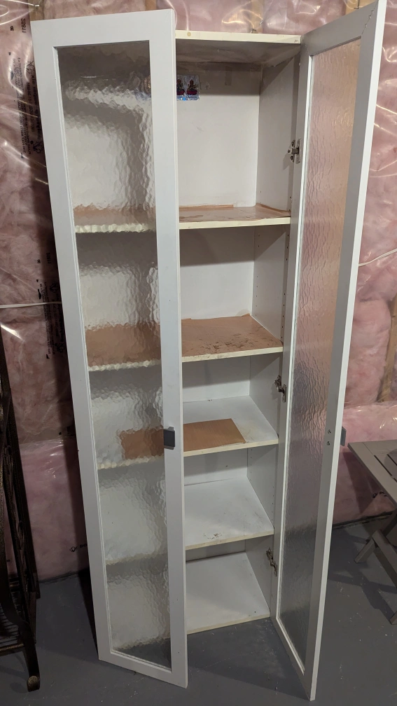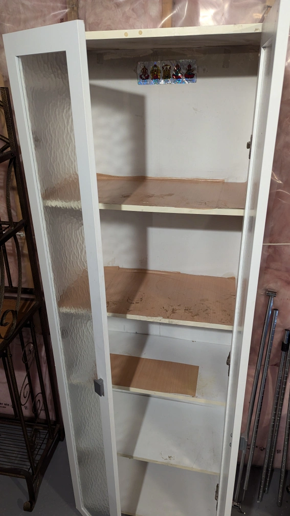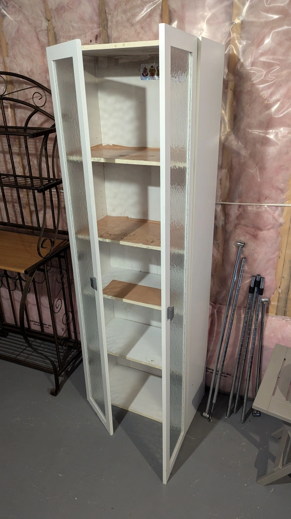 White cabinet with glass doors and 5 shelves. Good for storage or mandir usage.