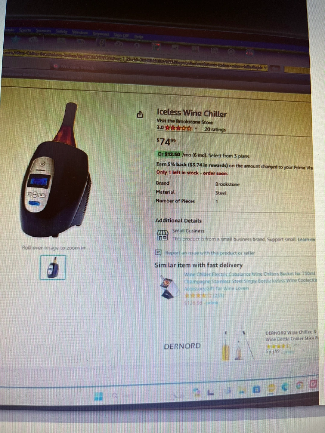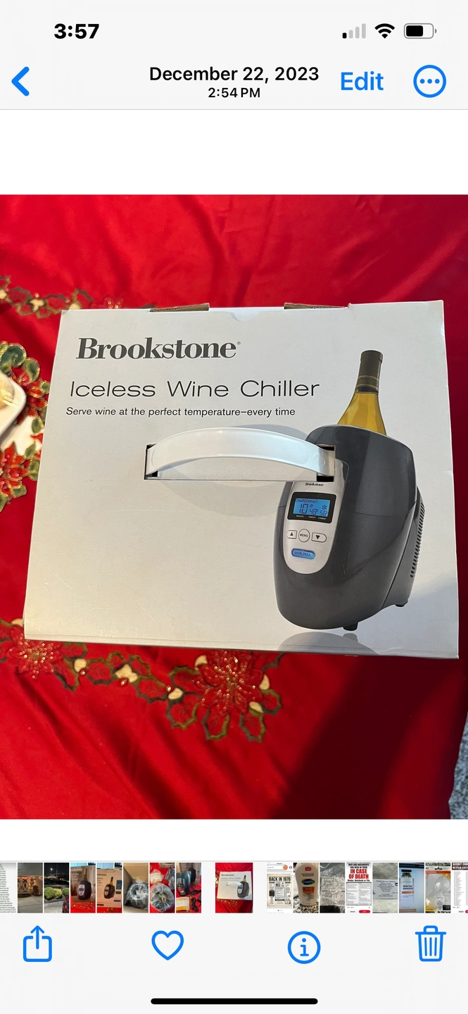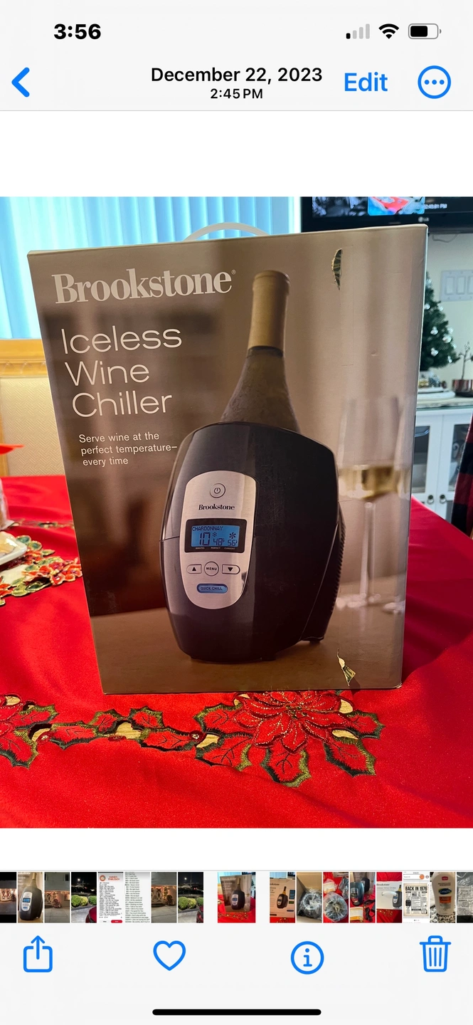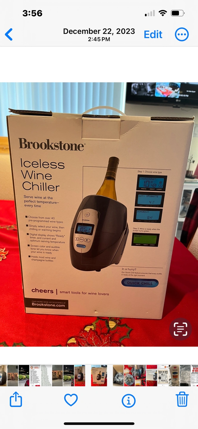 A Brookstone brand iceless wine chiller. It is blue and silver with a digital display. The chiller includes the power adapter.