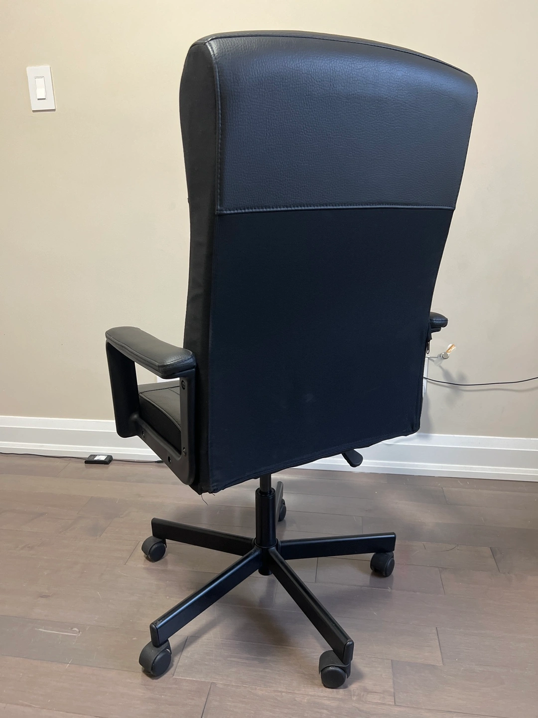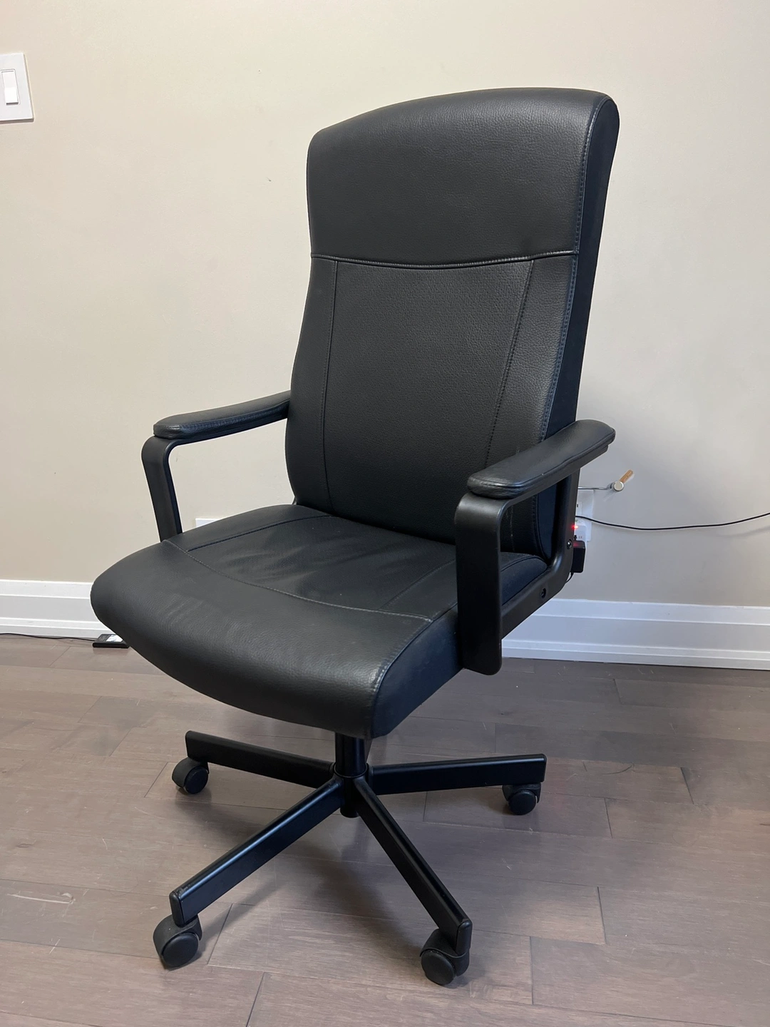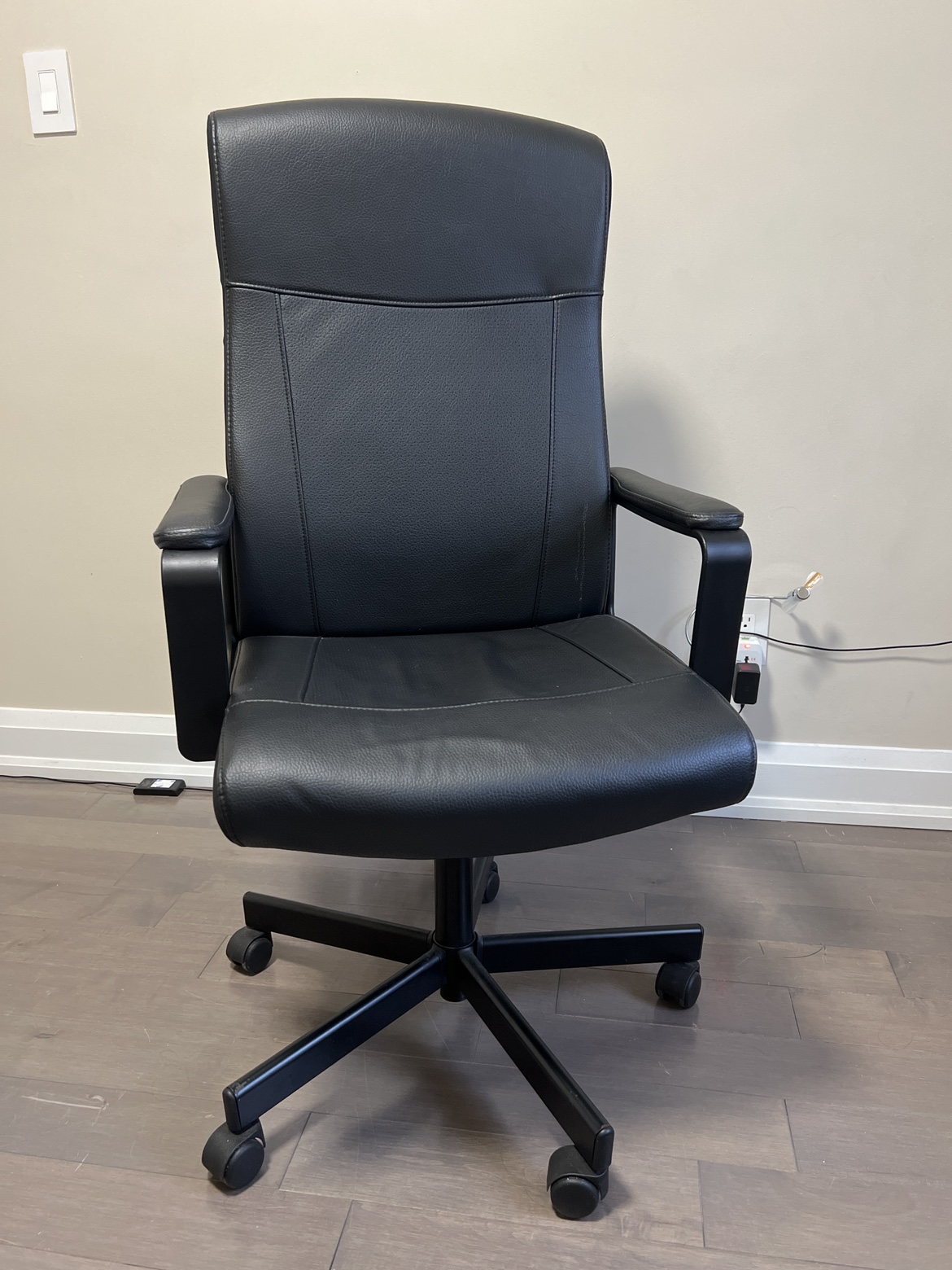 Selling my leather chair that's in great condition. It has adjustable height and a 360-degree swivel, making it easy to customize for your comfort. The chair has barely been used and comes with smooth-rolling wheels, perfect for any home or office setup. And it stays comfortably upright, helping you stay focused on your work.