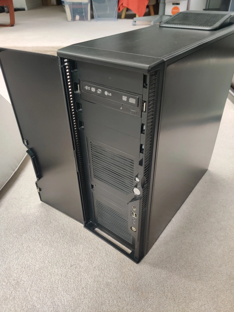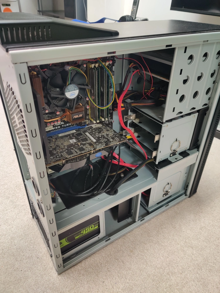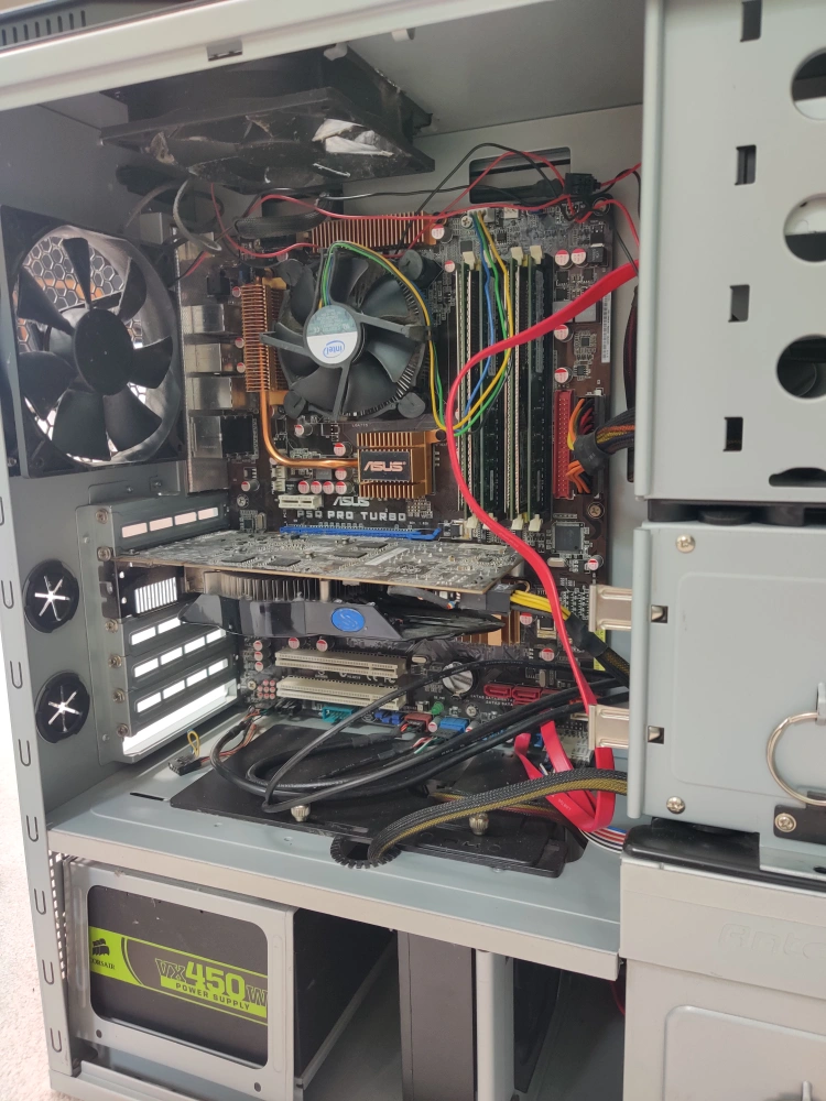 Includes an Asus P50 Pro Turbo motherboard, Pentium CPU (around 2 GHz, IIRC), 8 GB PC2-6400 RAM, LG DVD drive, Corsair VX450W Per supply, as well as a Vapor-X Radeon 5770 video card since I couldn't be bothered to remove them. This is a complete system other than a hard drive.