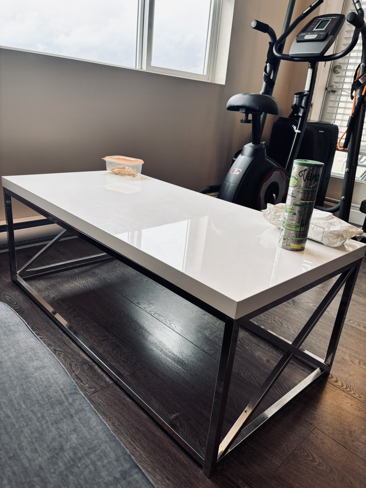 This table is perfect for your living room or home office. The table top is white with a high-gloss finish, and the legs are made of metal. The table is sturdy