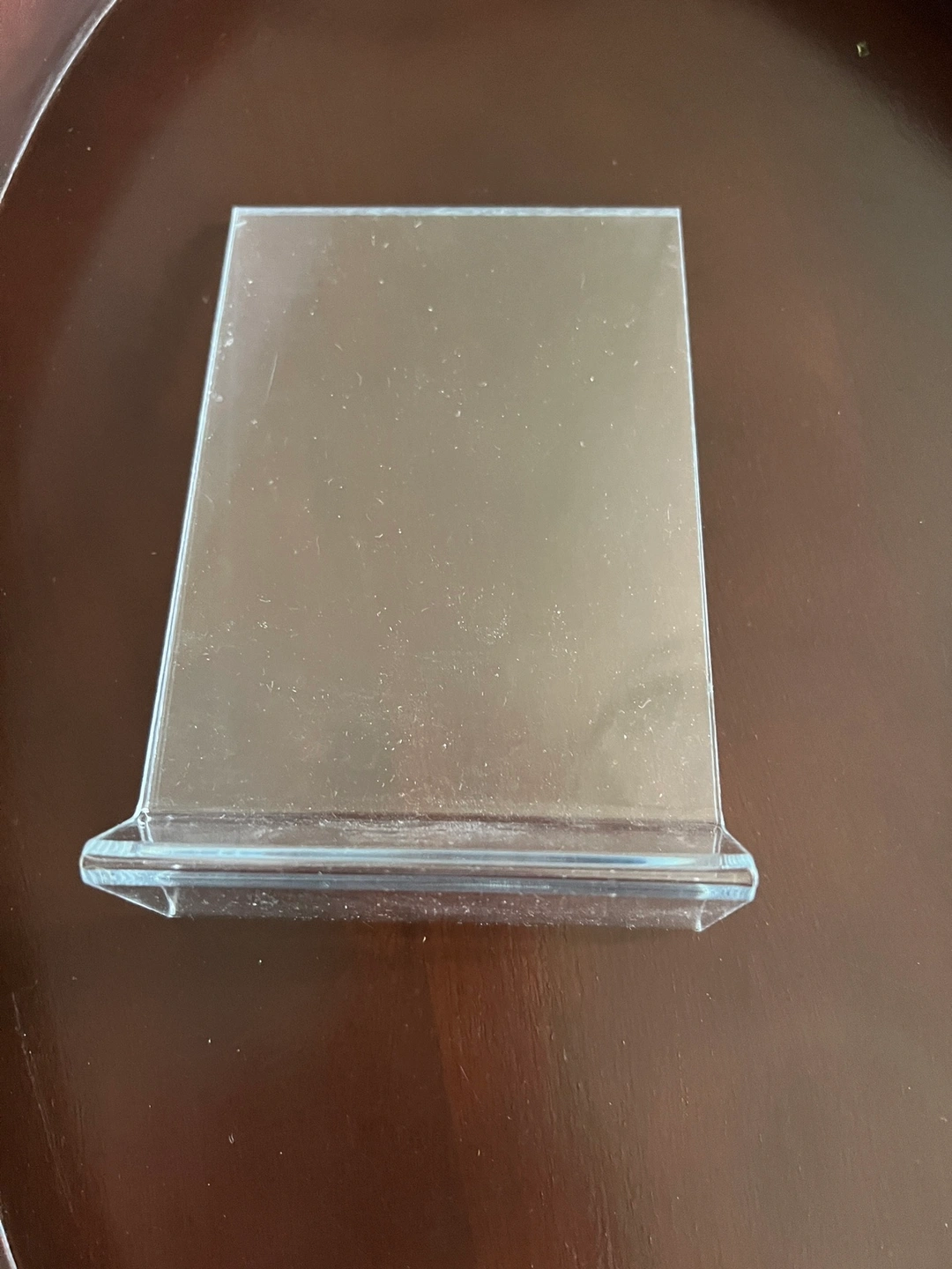 A clear acrylic display stand for showcasing items. It features a rectangular base and a raised platform to elevate your object.