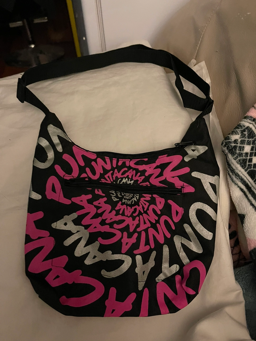 A small, black bag with a pink and silver design featuring the words "Punta Cana" repeated around the bag. There are two zippered compartments. It has a long adjustable strap.