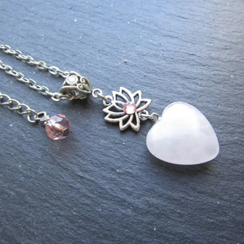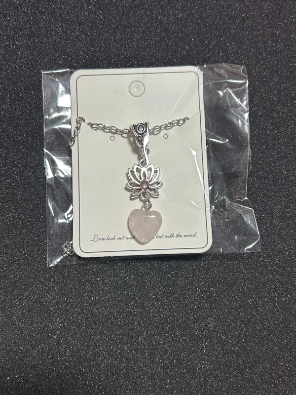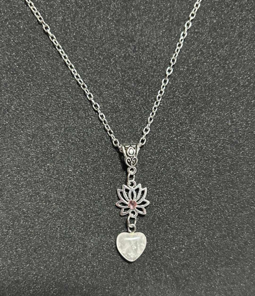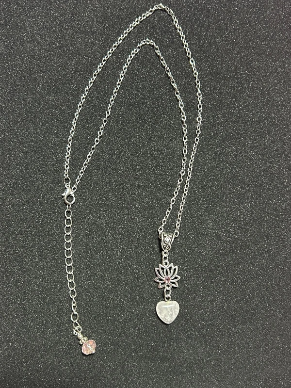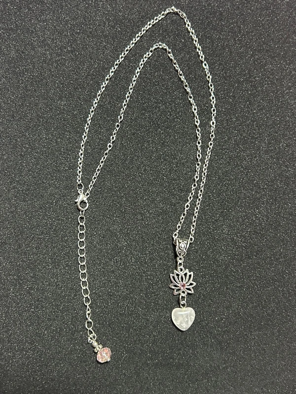 A silver chain necklace with a silver heart and lotus pendant. The pendant has a pink crystal in the centre of the flower. It has a small adjustable extension chain.