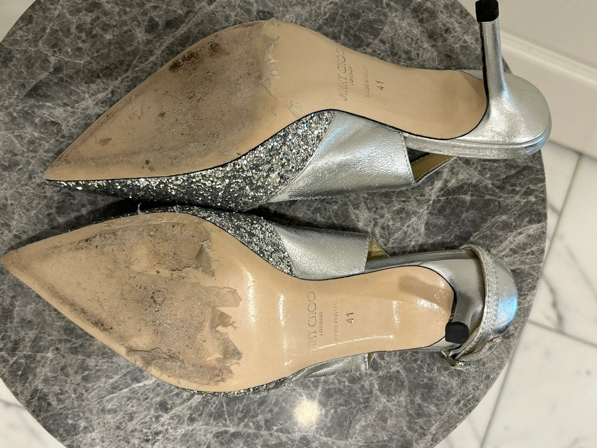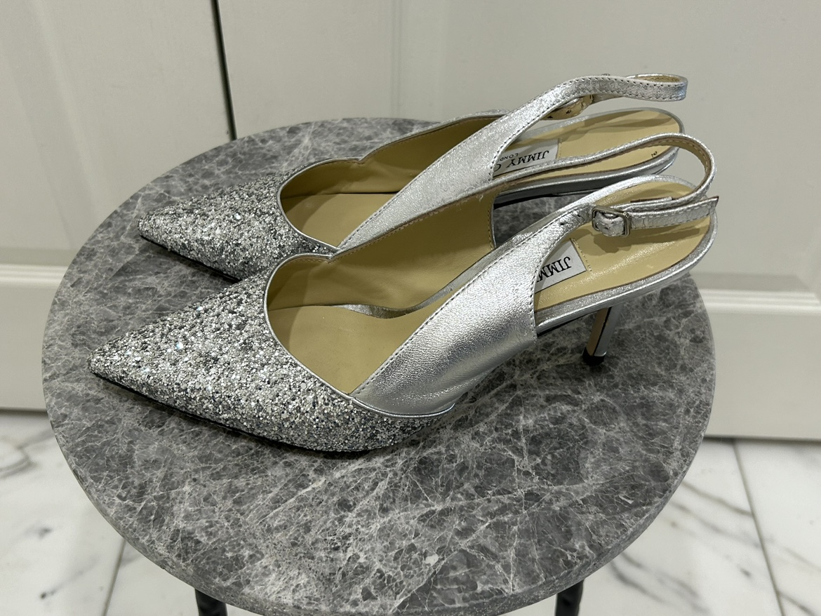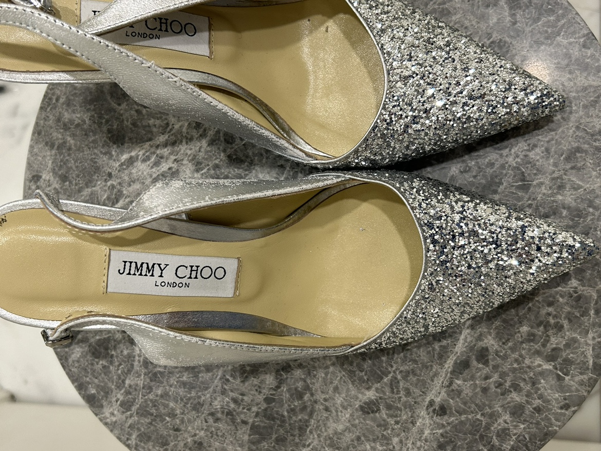10Jimmy Choo Silver Glitter Slingback Shoes. Glittered leather heels in silver-tone. Comes with dustbag and replacement heel tips. - Size 41 - fits like a 9.5 or 10 US size - Good condition with some wear and tear - See photos - Leather - Made in Italy - Pointed toe -Leather sole -Heel height: 2.5 in