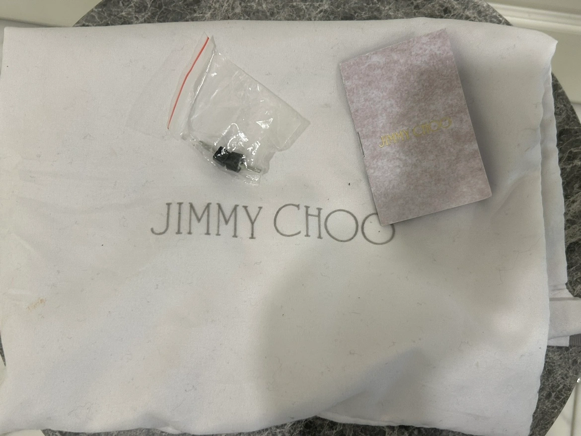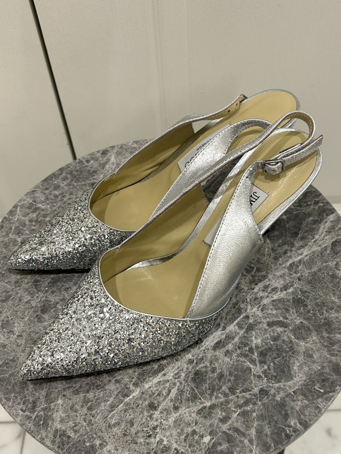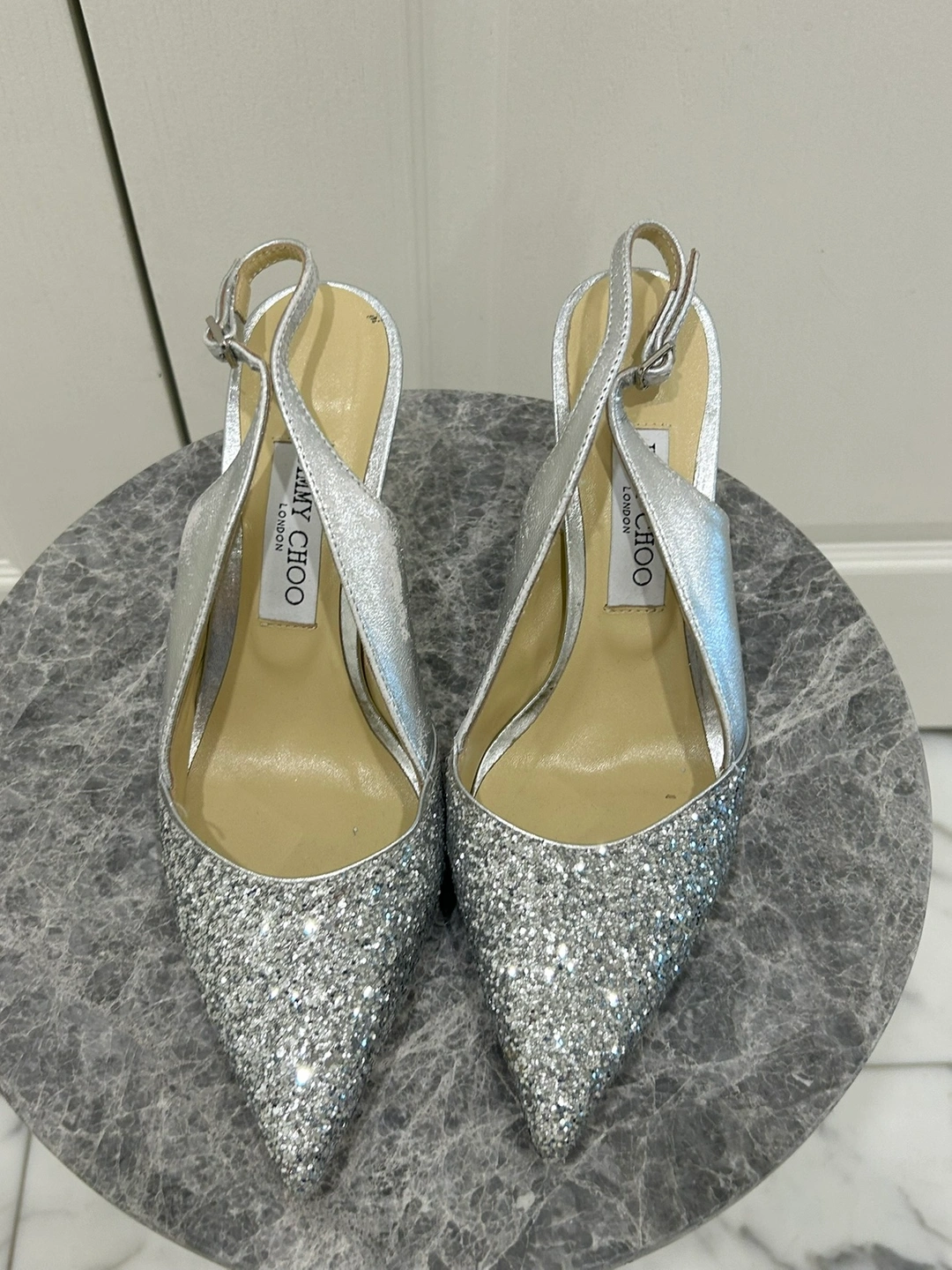 10Jimmy Choo Silver Glitter Slingback Shoes. Glittered leather heels in silver-tone. Comes with dustbag and replacement heel tips. - Size 41 - fits like a 9.5 or 10 US size - Good condition with some wear and tear - See photos - Leather - Made in Italy - Pointed toe -Leather sole -Heel height: 2.5 in