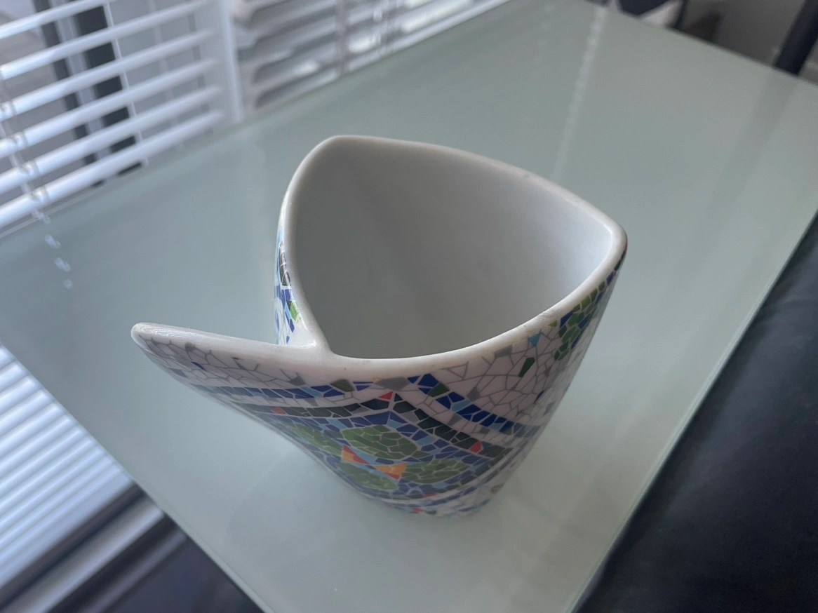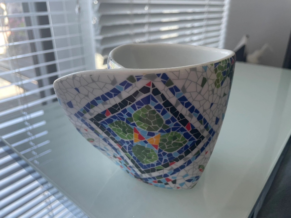 Unique ceramic mug with mosaic design. It is about 4 inches tall. Never been used, I use it as decorative item in my kitchen.