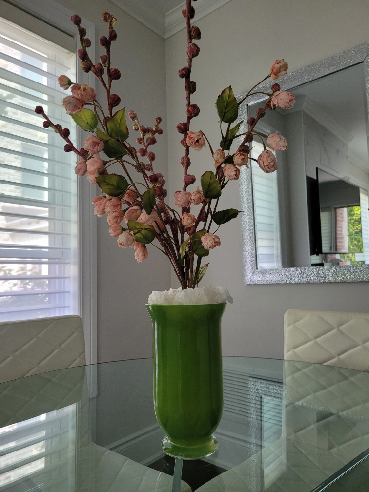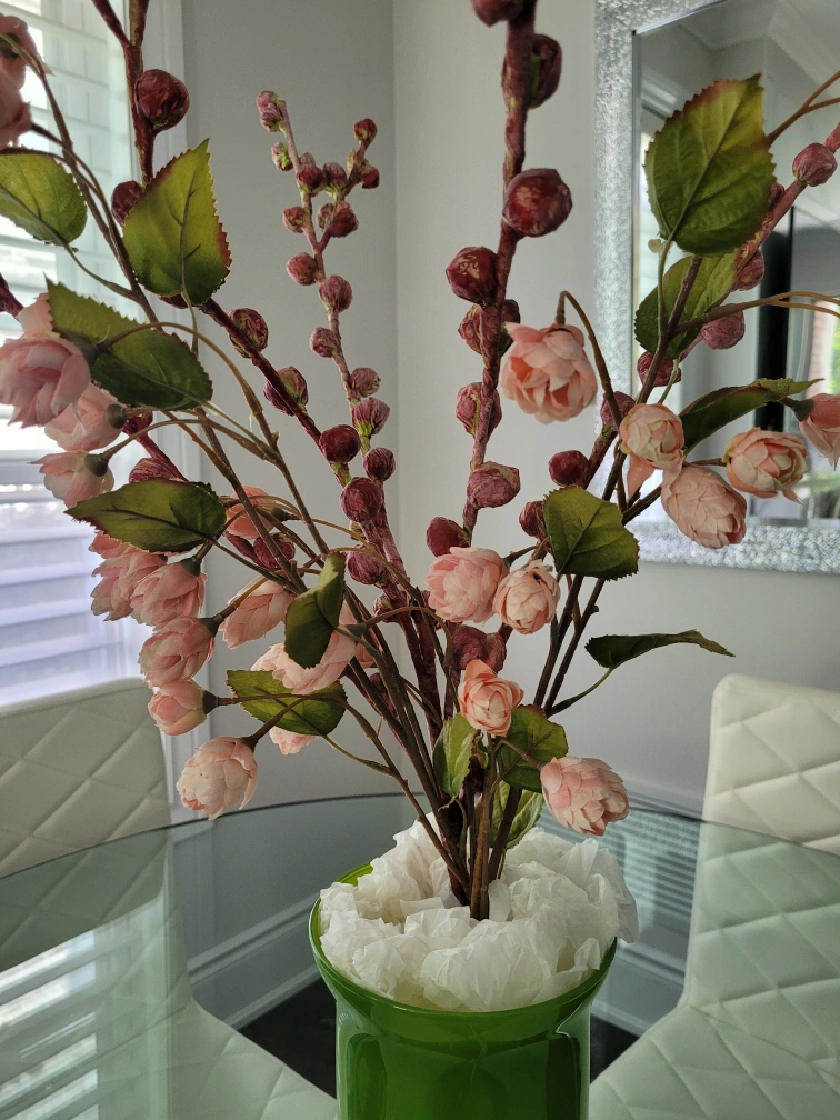 Beautiful artificial flower arrangement in a green vase. The arrangement features pink flowers and green leaves.