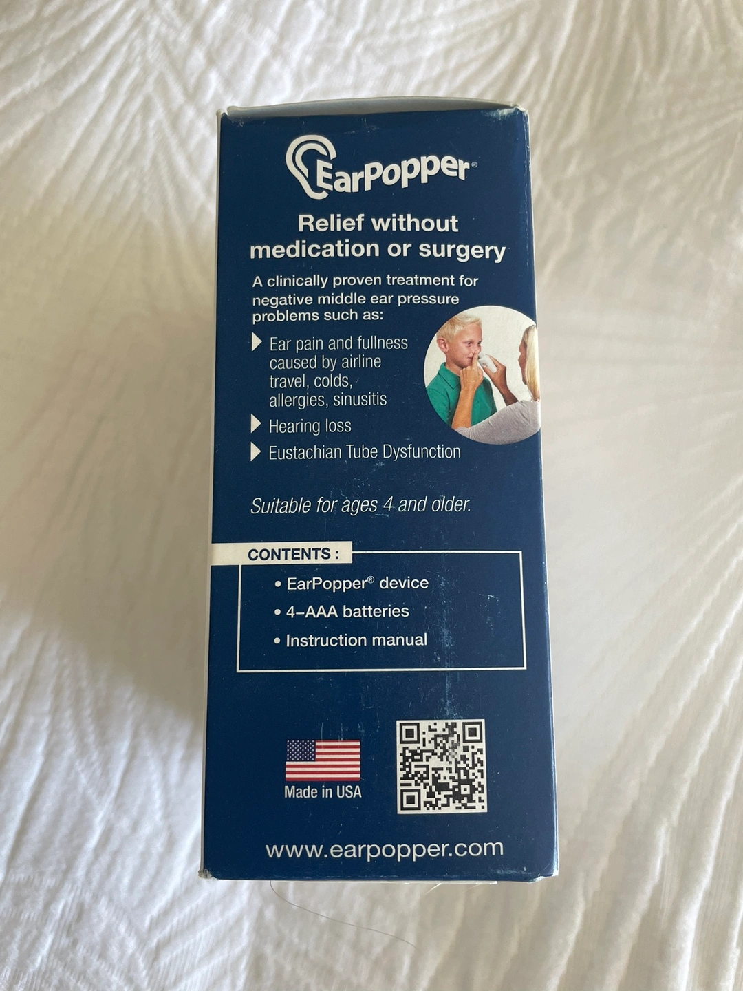 Ear Popper device for ear pressure relief. Includes instruction manual and batteries. Suitable for ages 4 and older. Made in the USA.
