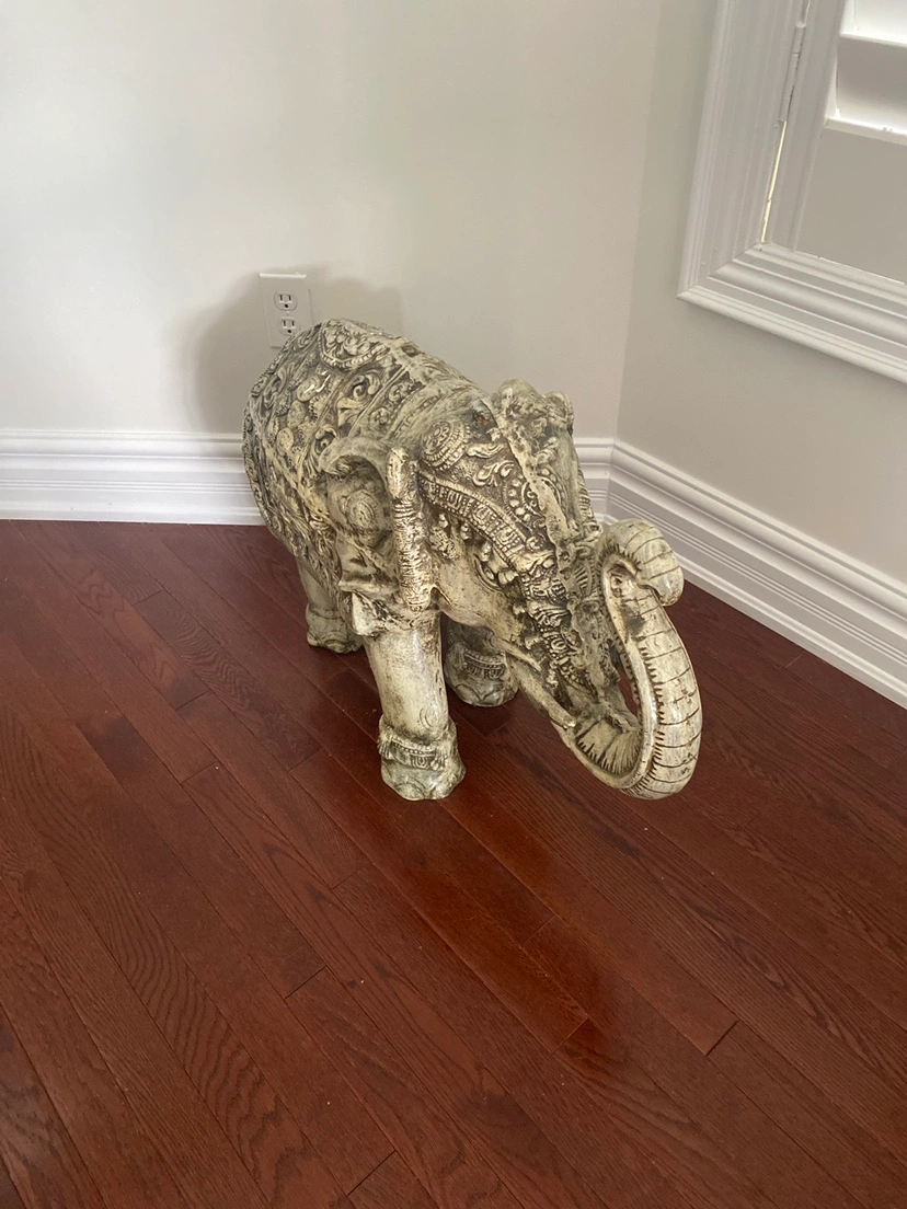A beautifully detailed and ornate elephant statue. It is made of a hard, heavy material, possibly resin. It would make a lovely addition to any home. Matching wall mirror