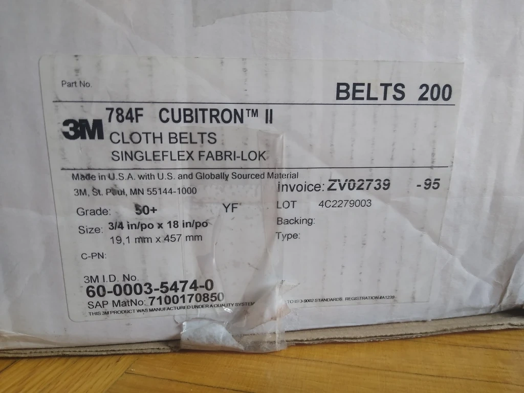 New, unopened box of 3M Cubitron II Cloth Belts 784F. Includes Singleflex Fabri-Lok belts. Grade 50+ with size 3/4 in x 18 in. Cash Only Pickup Only