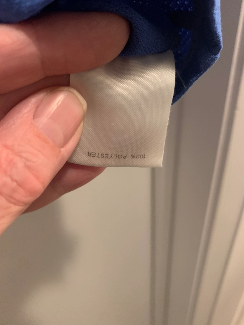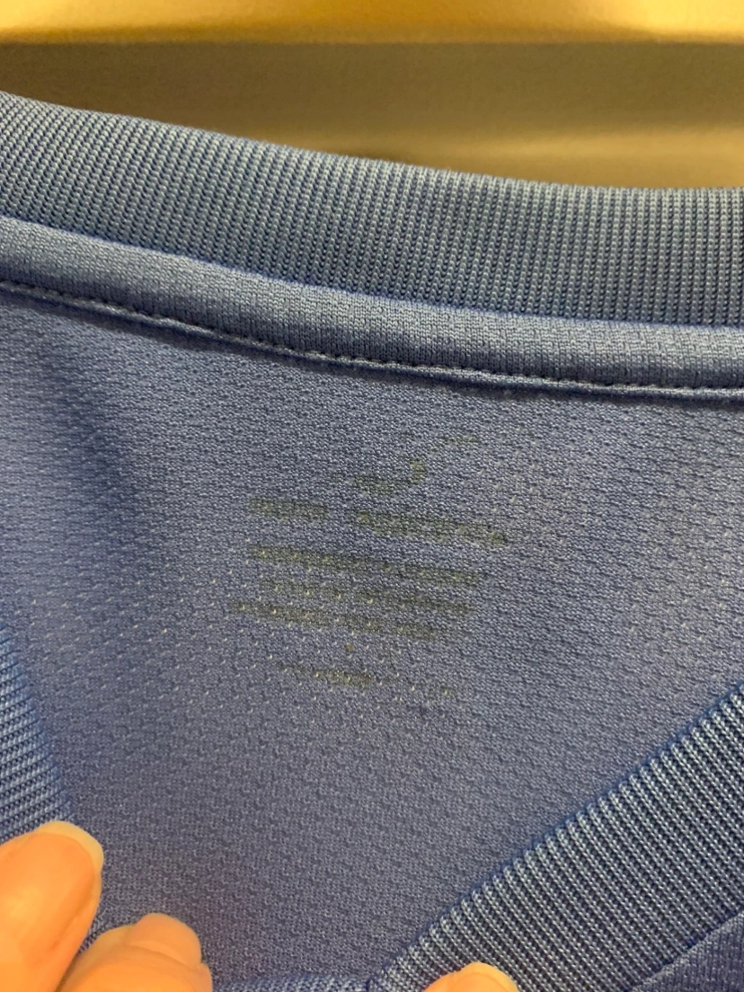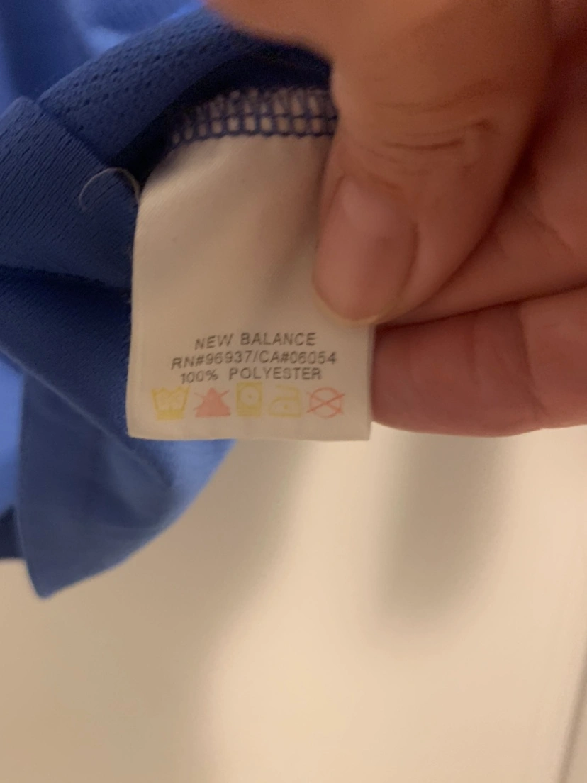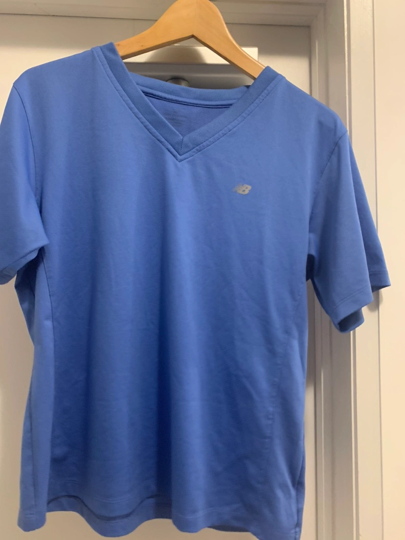 Pretty periwinkle New Balance. I can’t find the size for the life of me but it’s likely a large. It may be in the printing in the inside of the shirt but I’m unable to read it. Currently pretending I don’t need glasses.